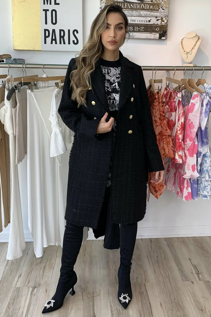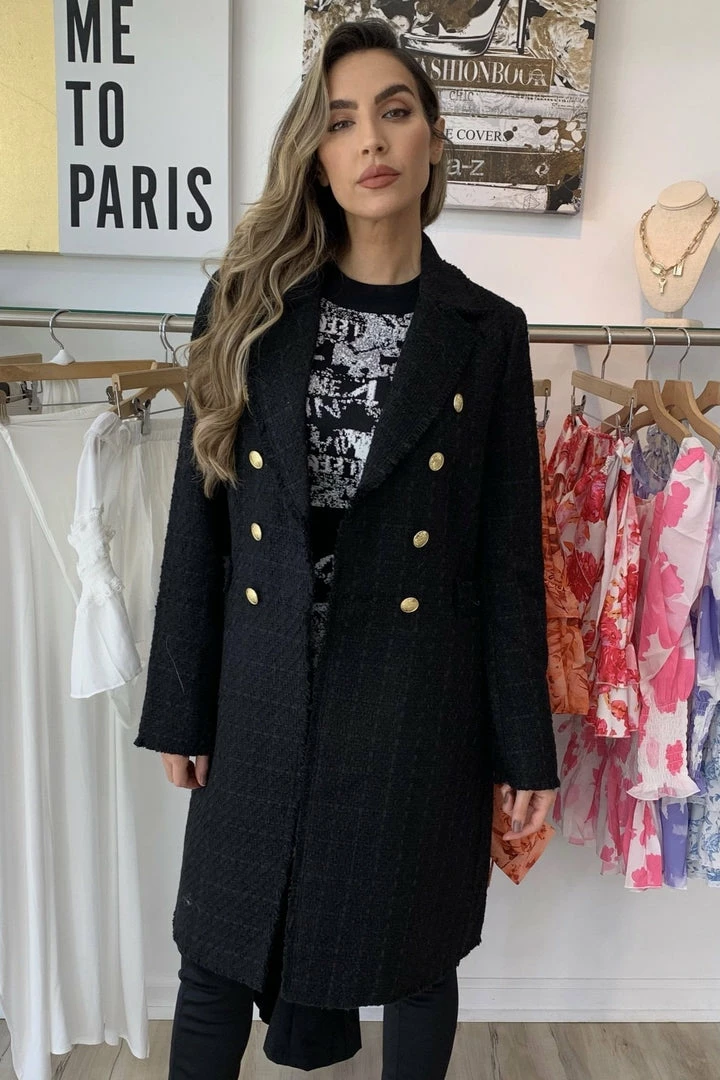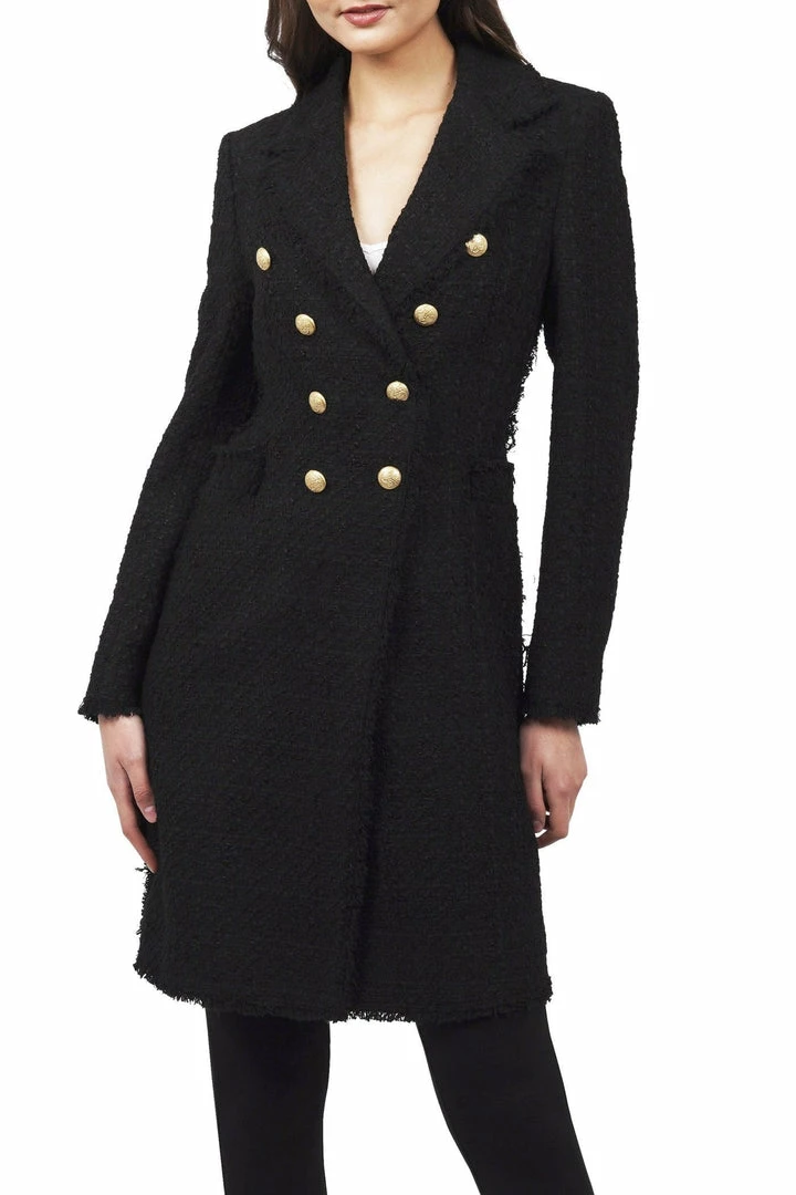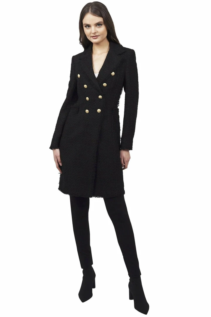 Notched collar, raw edges, double breasted long blazer, button closure with 8 gold buttons, 5 gold buttons on each cuff (0 inner pockets). Material: 100% Polyester.