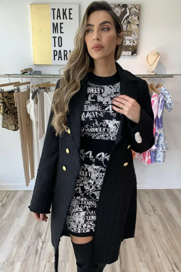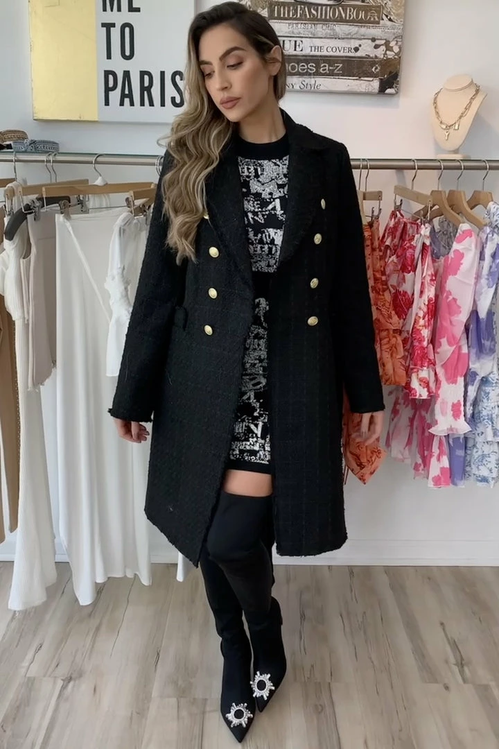 Model is wearing the jacket with our Ursula dress and Miranda boots.