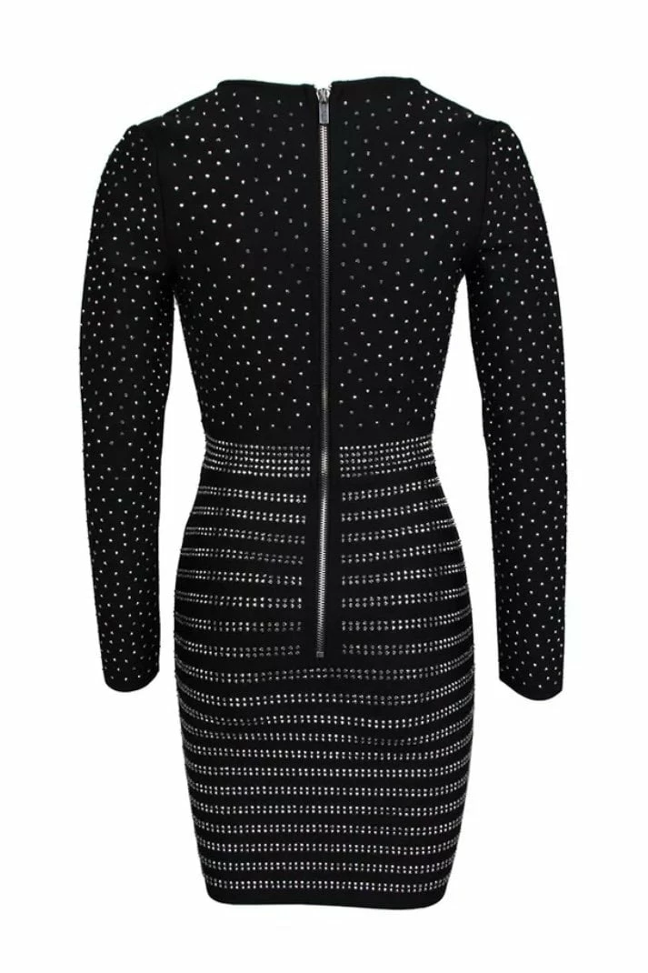 This long sleeve dress features a deep neckline with alternating patterns of crystal rhinestones and a wrap skirt to shine in the best way possible! Pair this stunning piece with rhinestone heels to really amp up your nights out.