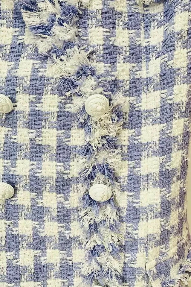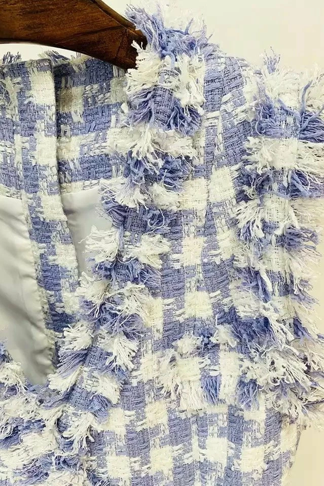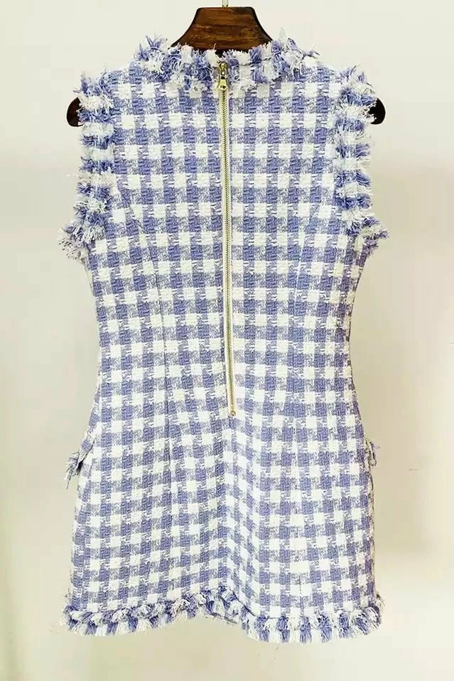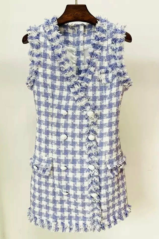 Look elegant yet stylish in this cute blazer dress! Featuring a Tweed material, sleeveless style and beautiful button detailing. Pair with nude stilettos or white sneakers for a chic look!
