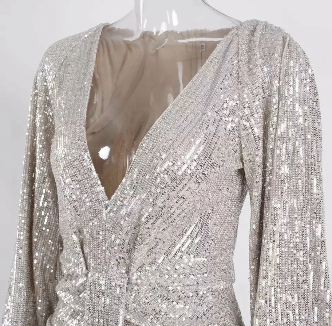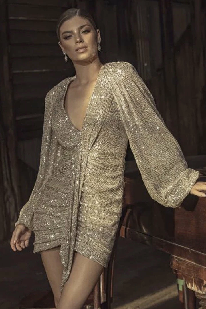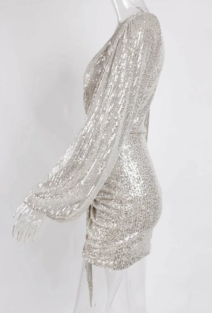 Inundated with sparkling sequins, the dress makes the perfect party-ready piece. Featuring a sequin material, long sleeves, v-neck style, draped detailing, bodycon fit, and mini length. Pair with a red lip and strappy heels for a sexy look.