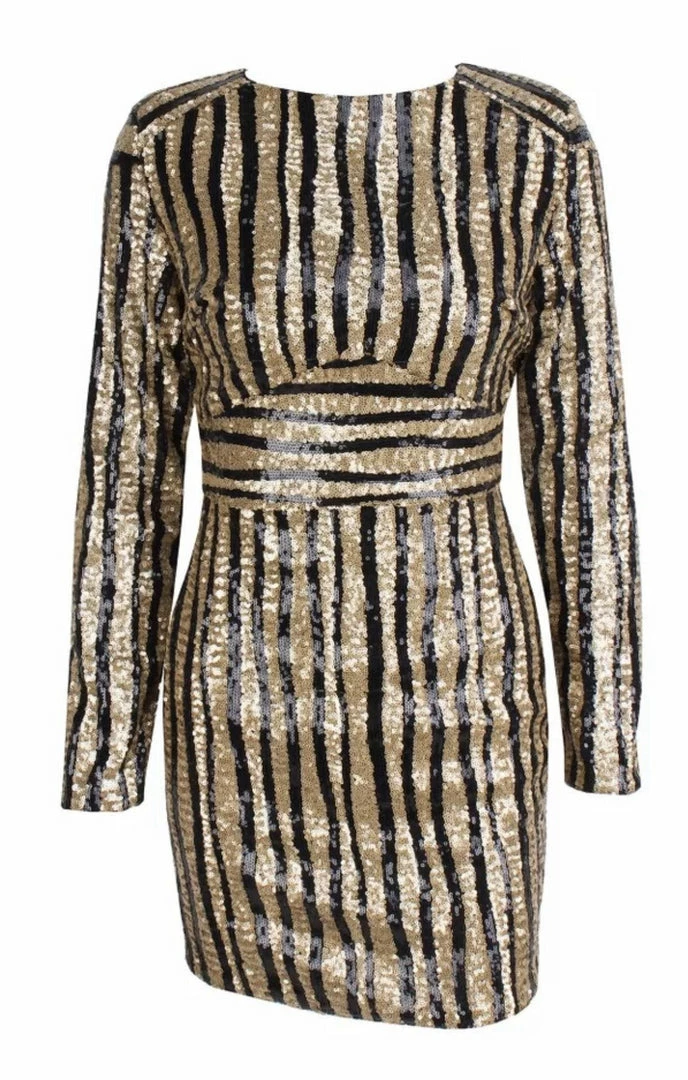 Shine brighter than the stars in the ‘Lamont’ mini dress! This shimmering design has a black and gold sequin material, long sleeves, bodycon fit, and mini length. Pair with sheer black tights and black pumps for an ultra sexy party look.