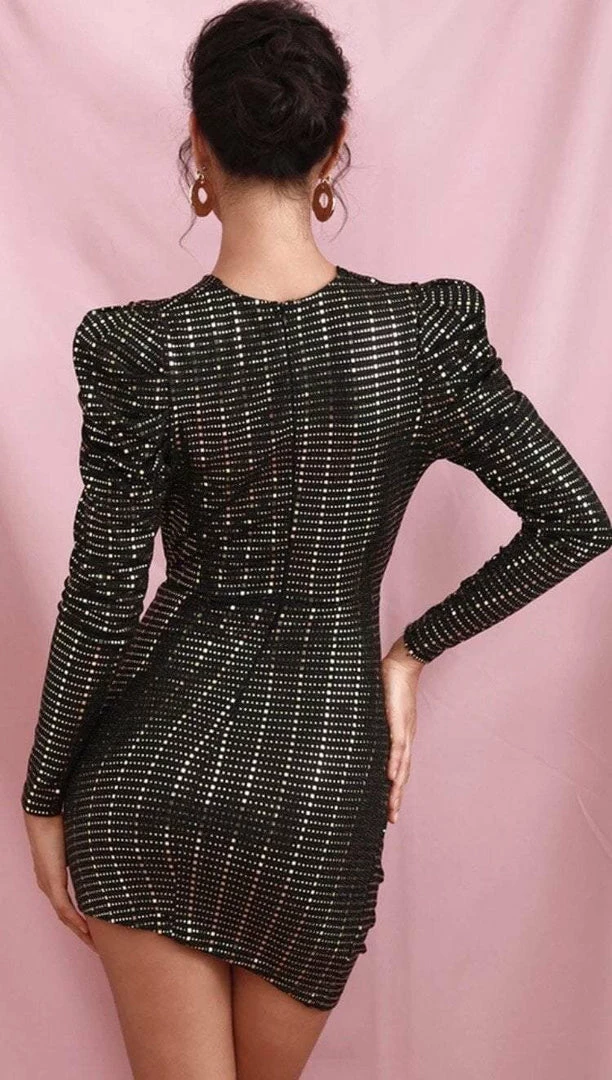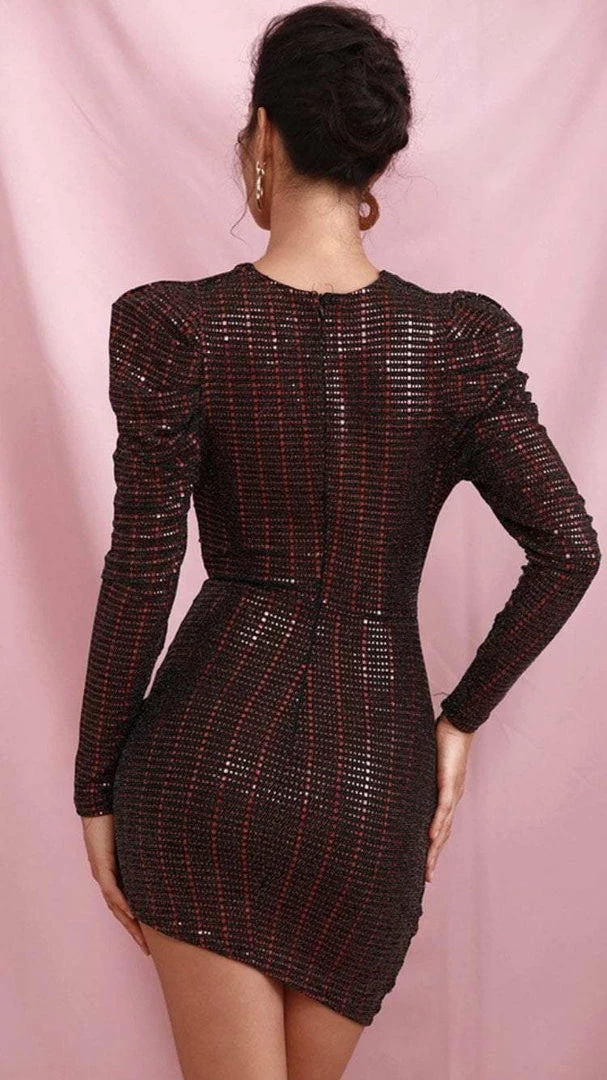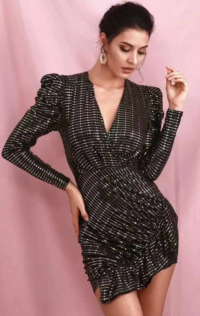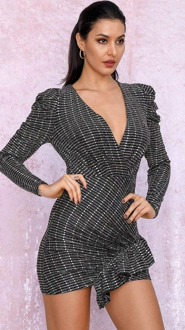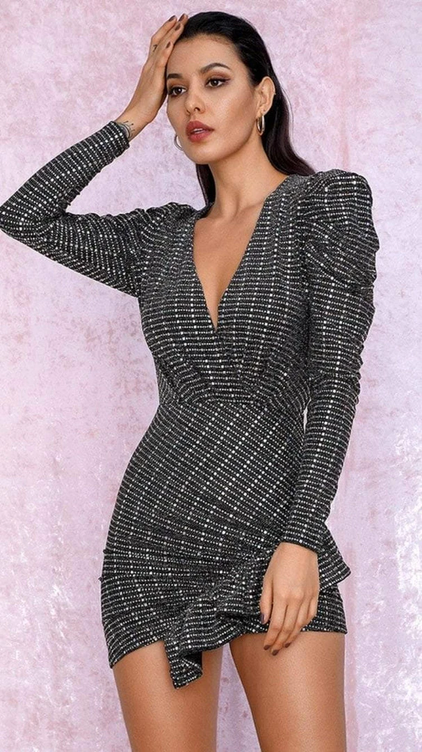 Look instantly fabulous in this sexy mini dress. Featuring a deep v-neck, puffy long sleeves, and a ruffled detailing that’ll make everyone give you a double take!