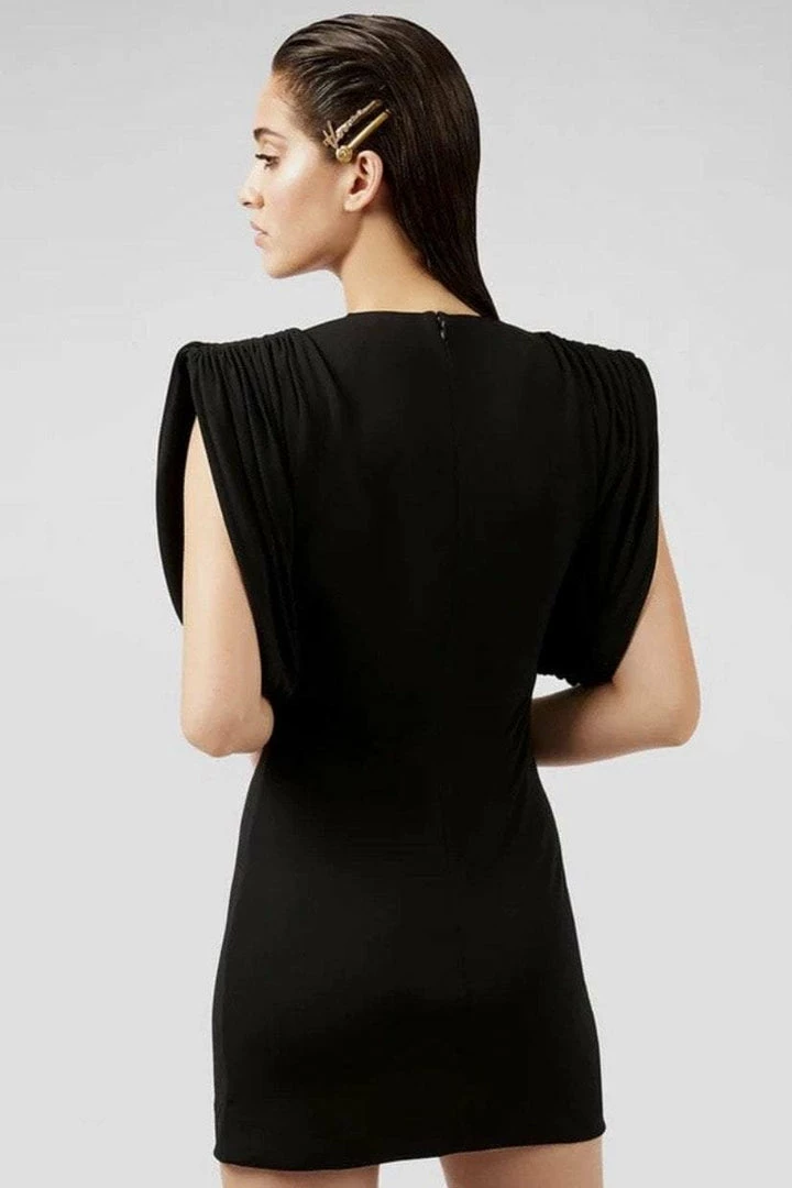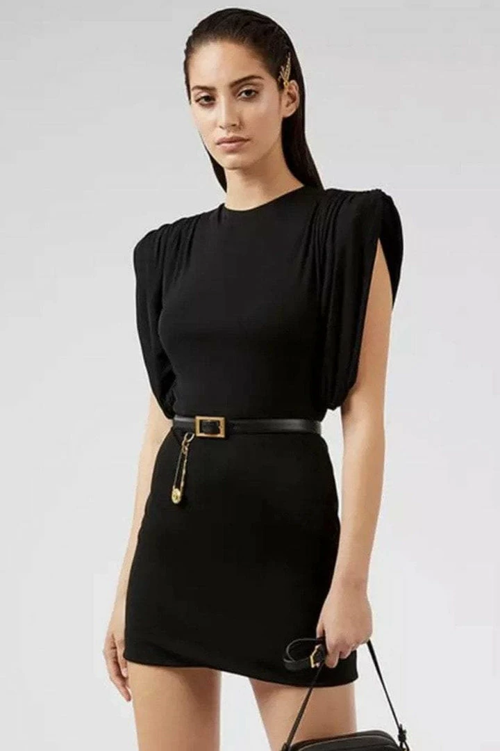 Win all the style points in this chic mini! Featuring short structured sleeves, bodycon fit, and a mini length. Pair with booties and a fun belt to complete the look.