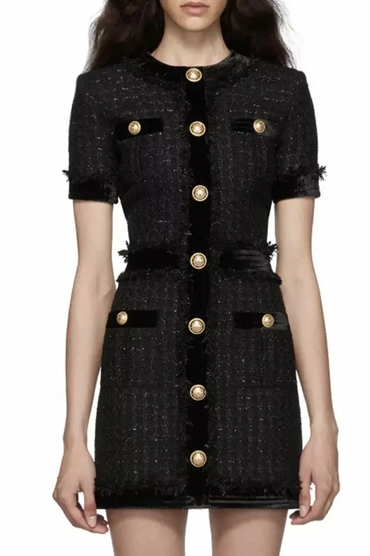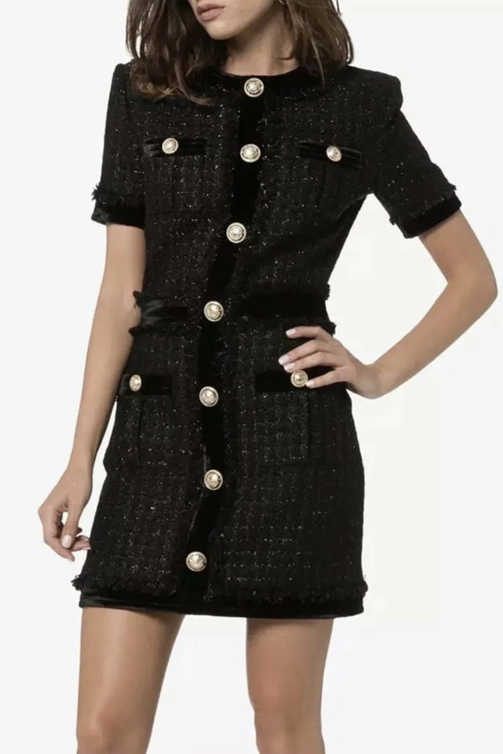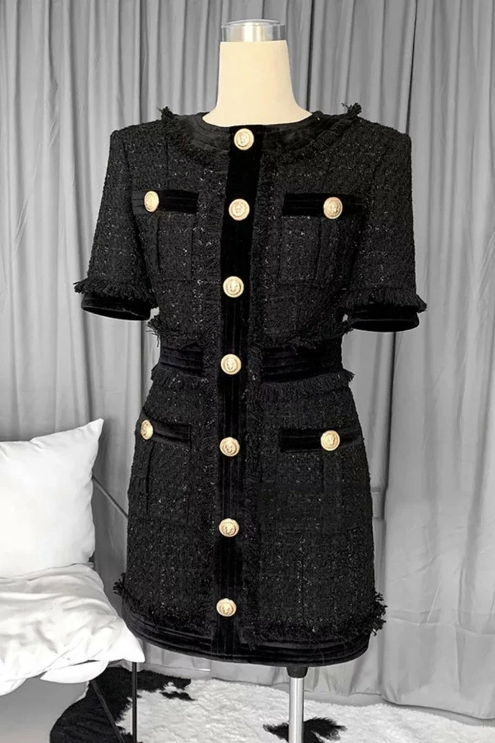Whether you are heading to date night, brunch with girlfriends, or roaming around the city, the ‘Lena’ dress is perfect for you. Featuring a shift dress silhouette, tweed material, gold button embellishments, short sleeves, and mini length. Pair with black heels!