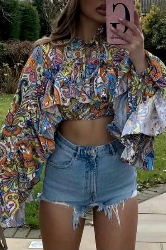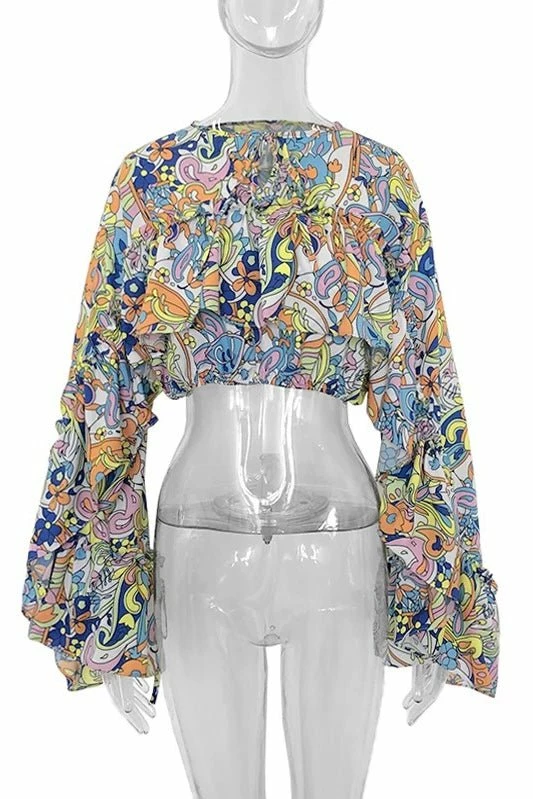 This summer staple is sure to pop. Featuring a long sleeve, fully ruffled crop top with a bright multi-colored funky pattern. Team with shorts and sandals to run around looking fabulous!