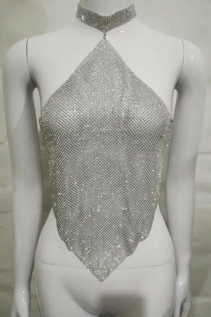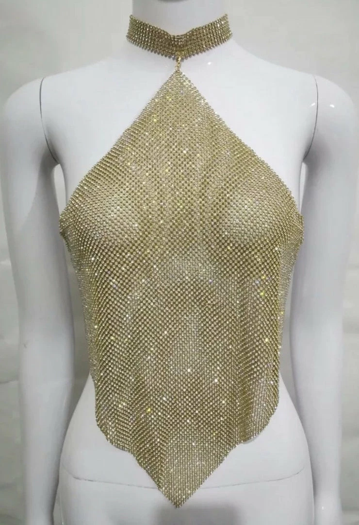 Perfect for your next special night, the ‘Lindsey’ top will have you looking super sexy! Featuring a rhinestone material, halter neckline, open back, and cropped length. Pair with jeans and strappy heels.