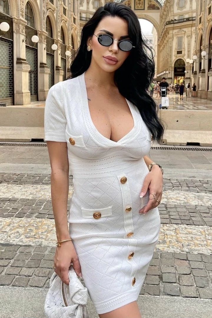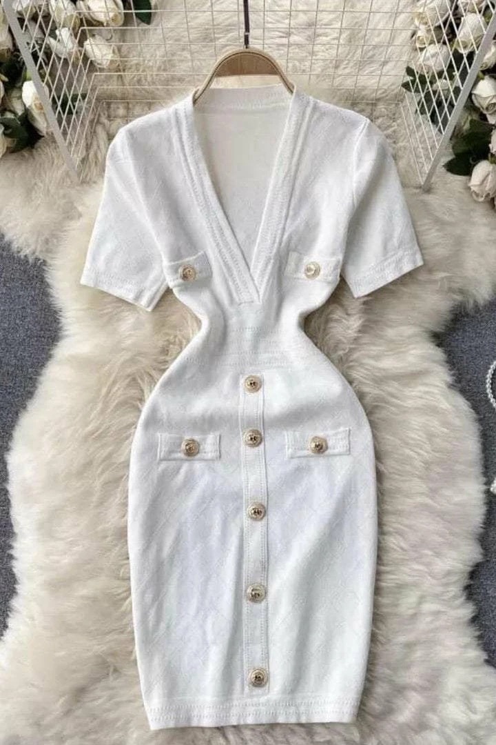 The Lizzie dress features gold buttons accenting the dress and faux pockets, made to cinch the waist, this gorgeous short sleeve dress is a summer staple for any Reve Doll who wants to be comfy and stylish. Pair with your favorite gold jewelry and wedges to usher in the summer in style!