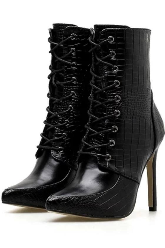 These killer booties will instantly elevate any look! Featuring a PU leather material, snakeskin detail, lace up style, and 4 in heel.