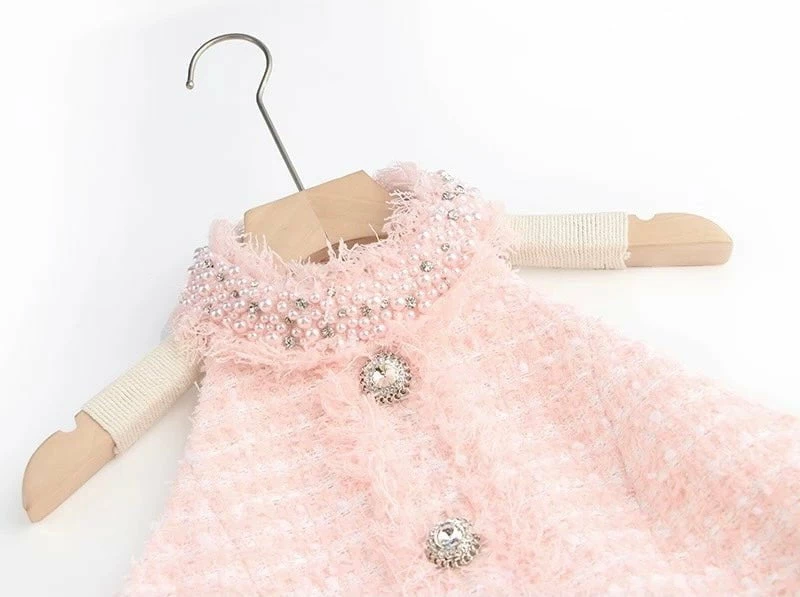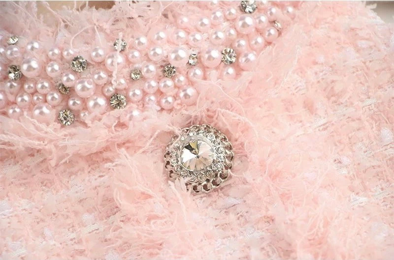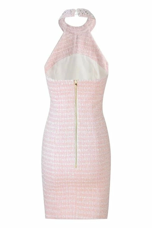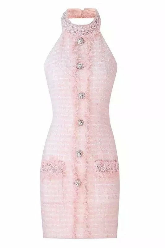Look like an absolute doll in this totally chic mini dress! Featuring a tweed material, rhinestone detailing, a high neckline, and a low cut back. Pair with ankle strap heels and a mini bag for a daytime outing with the girls!