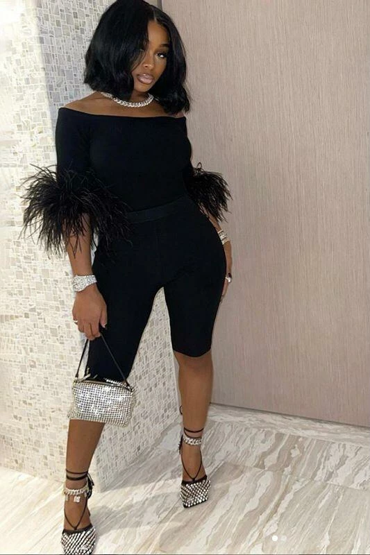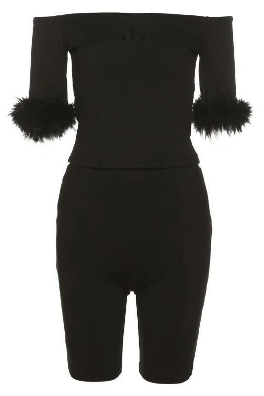 This adorably detailed set will have you looking fabulous. Featuring an off the shoulder top with quarter sleeves, feather lined cuffs, and matching biker shorts. Add stylish accessories like a belt, thigh high boots, bling, or a hat to take this set in any direction!