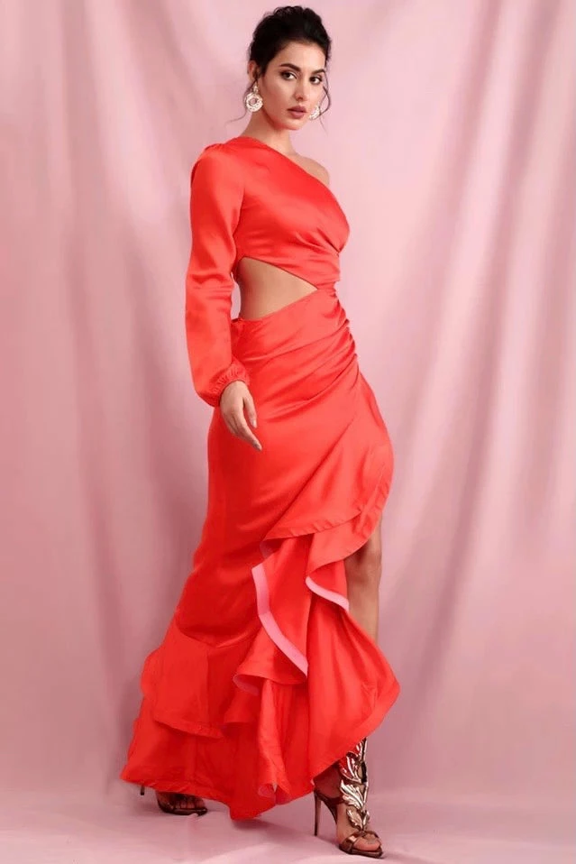This dress is the elegant eye catcher. It features a one shoulder long sleeve, a side cut out, ruched detailing up the opposing side, and a high leg slit with a ruffled hem. Pair this with pumps and big hoops for a gorgeous look to any wedding, red carpet, birthday, or formal event.