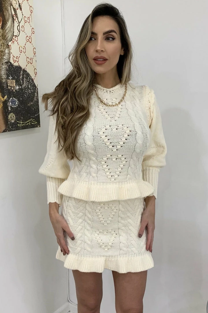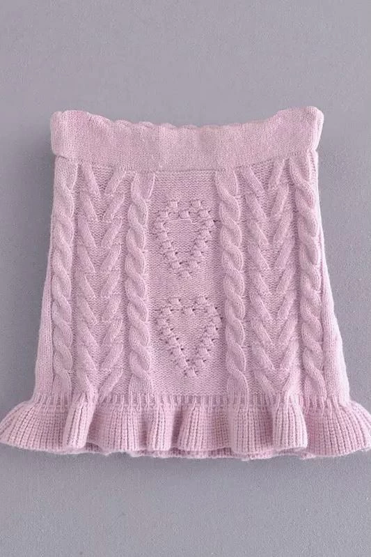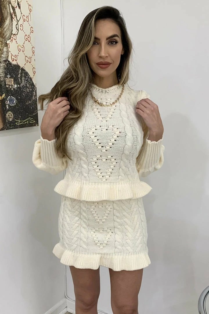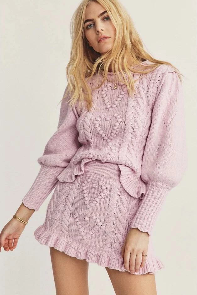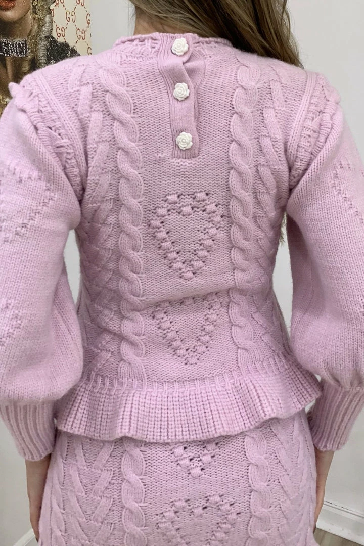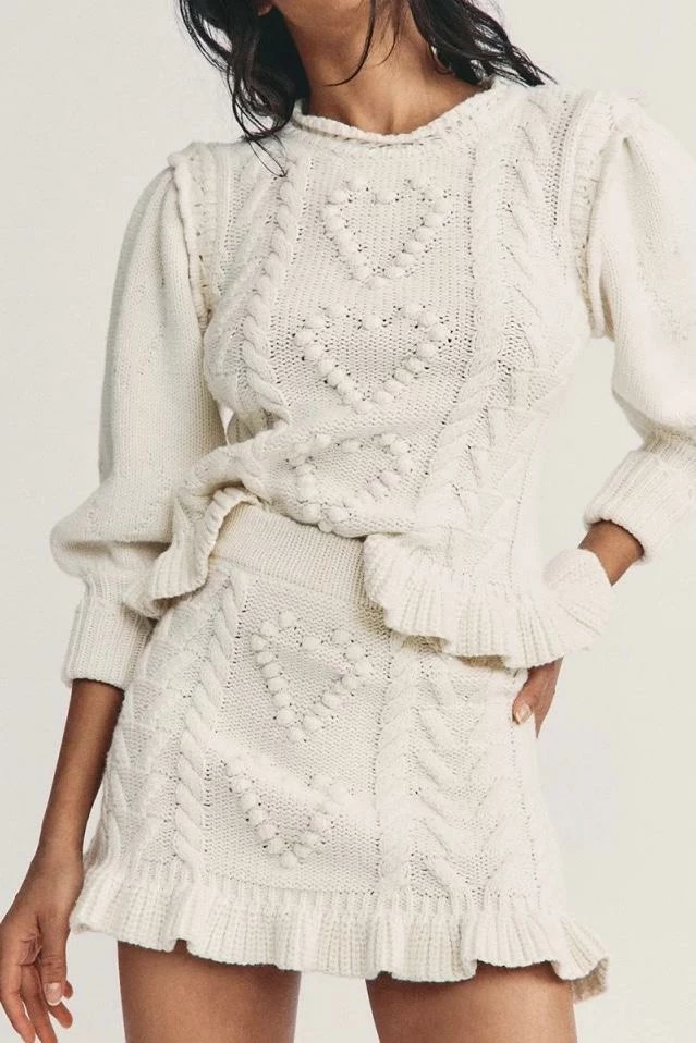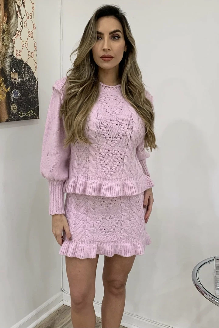 Cuddle up in this cute fit this season featuring long sleeves, a fuzzy twisted knit material, and a heart shape pattern on a sweater and matching mini skirt. Pair with fuzzy slippers to be comfortably cute around the house or pair with boots and a long coat for a casual afternoon errand.