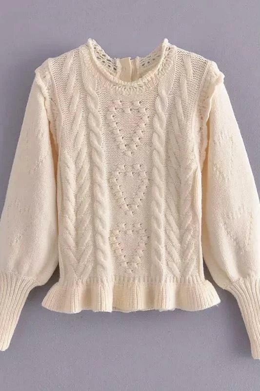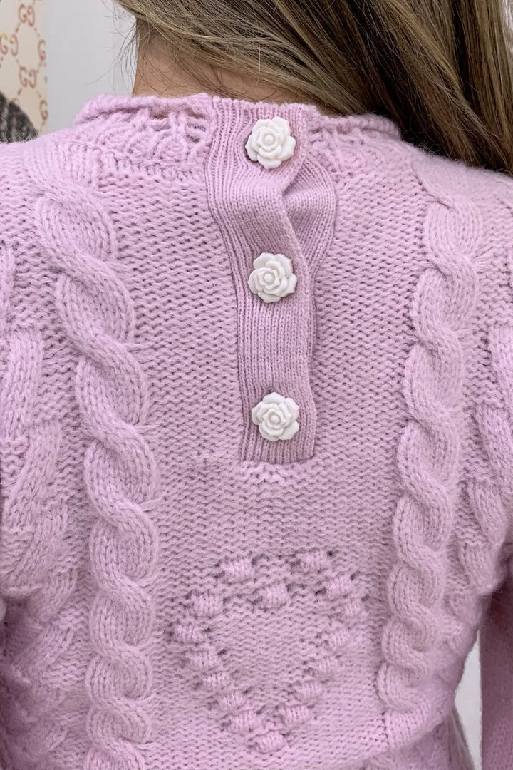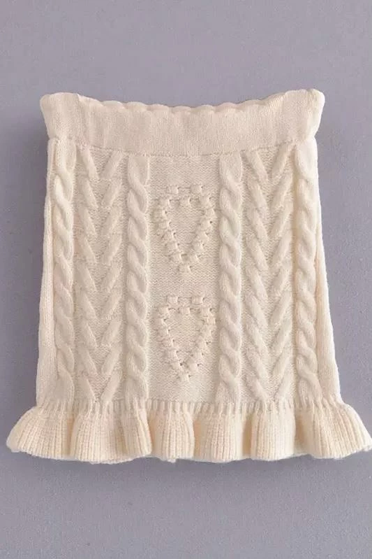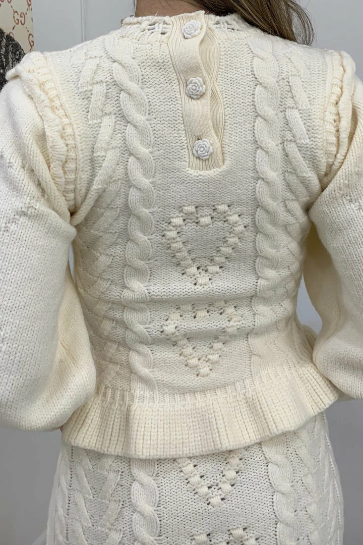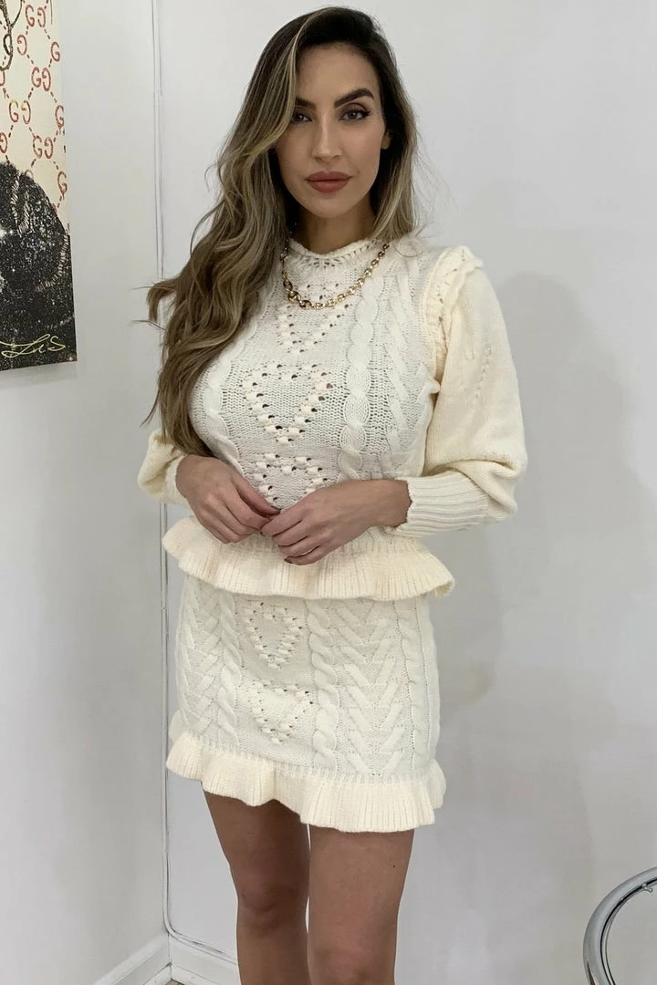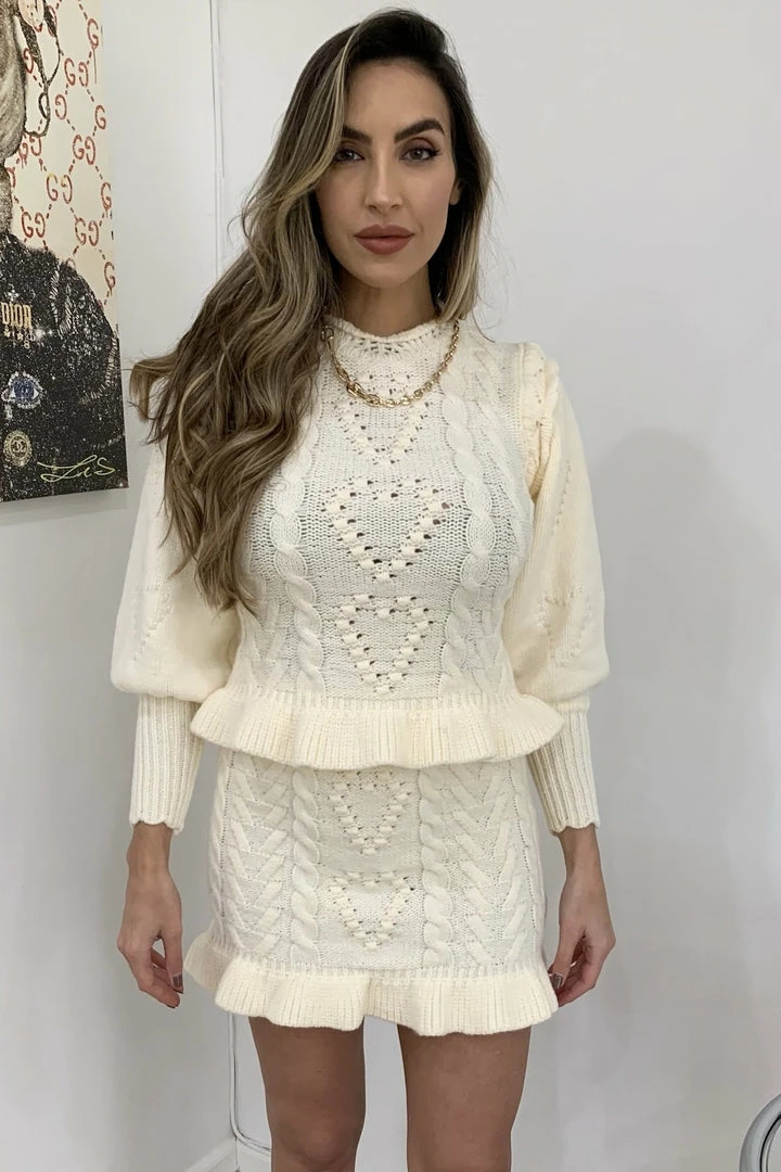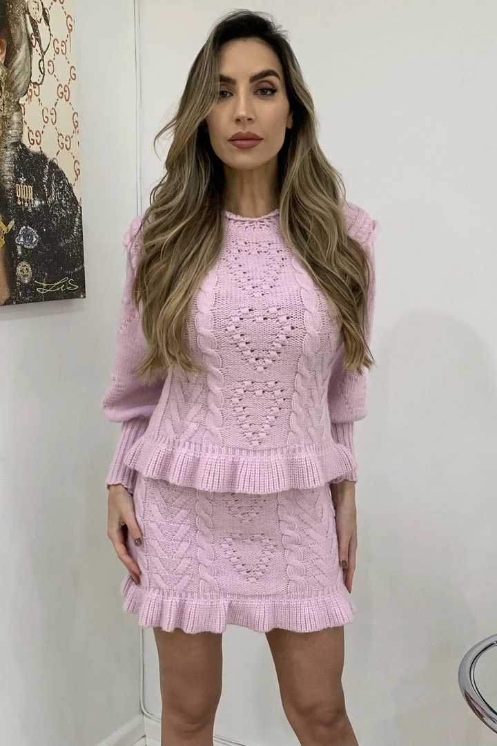 Cuddle up in this cute fit this season featuring long sleeves, a fuzzy twisted knit material, and a heart shape pattern on a sweater and matching mini skirt. Pair with fuzzy slippers to be comfortably cute around the house or pair with boots and a long coat for a casual afternoon errand.