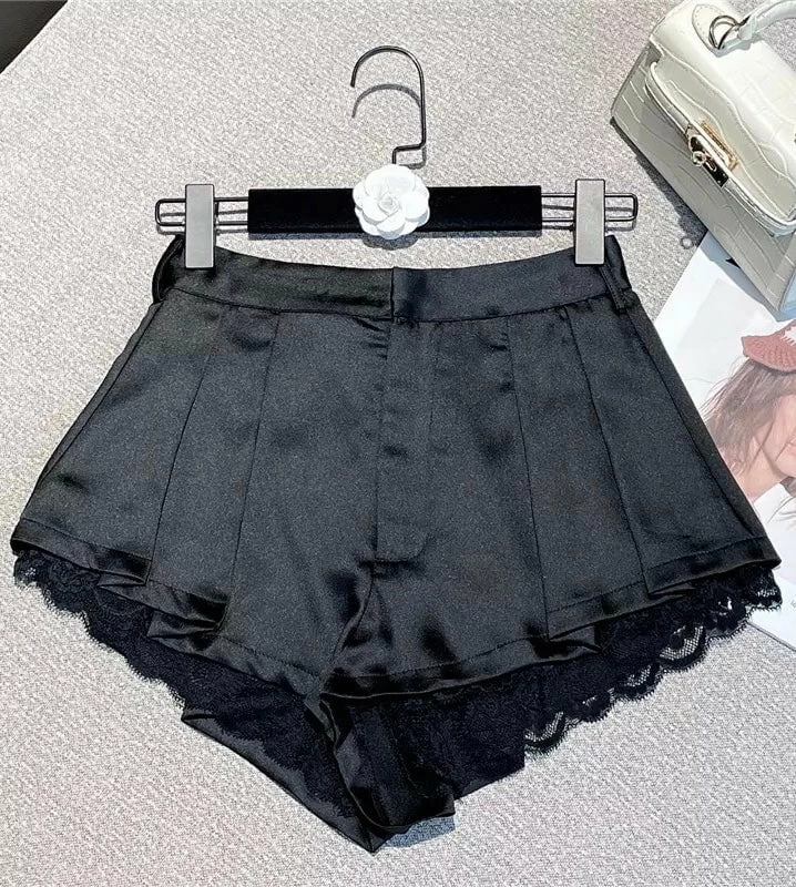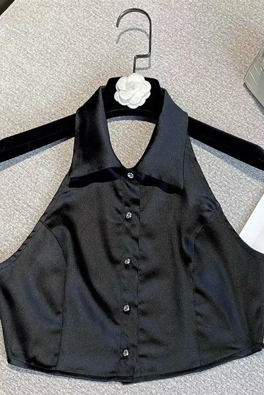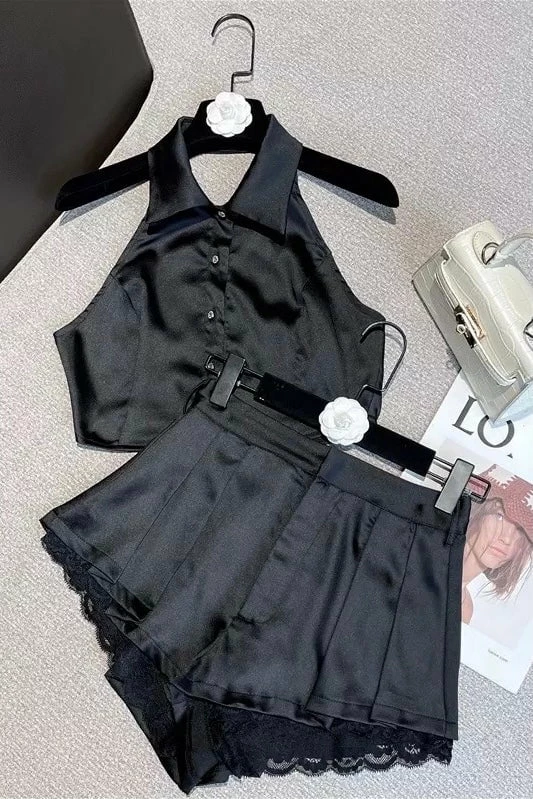 Lounge like a total babe! This two piece set features a button down halter top with a cropped style, silk-like material, and comes with matching mini shorts with a laced hem. Going off to bed never looked so glamorous.