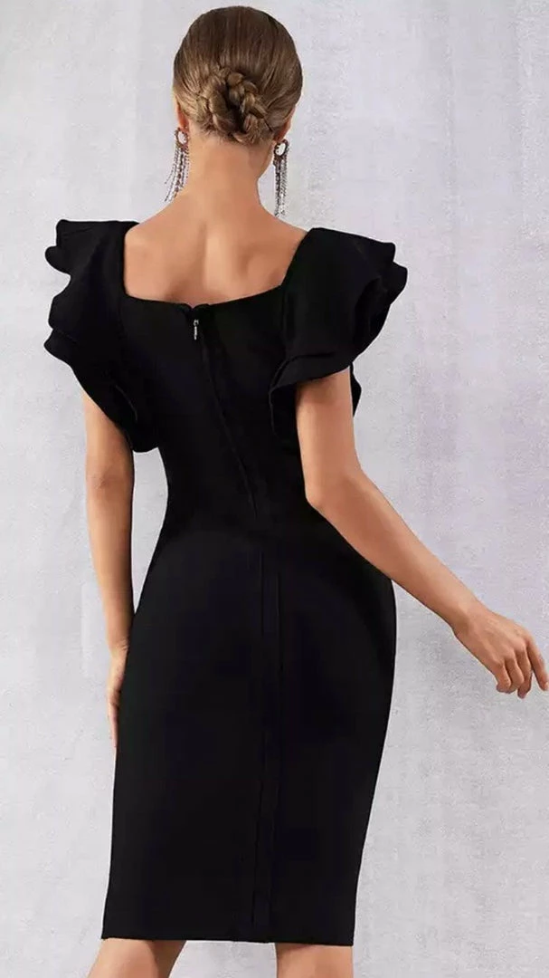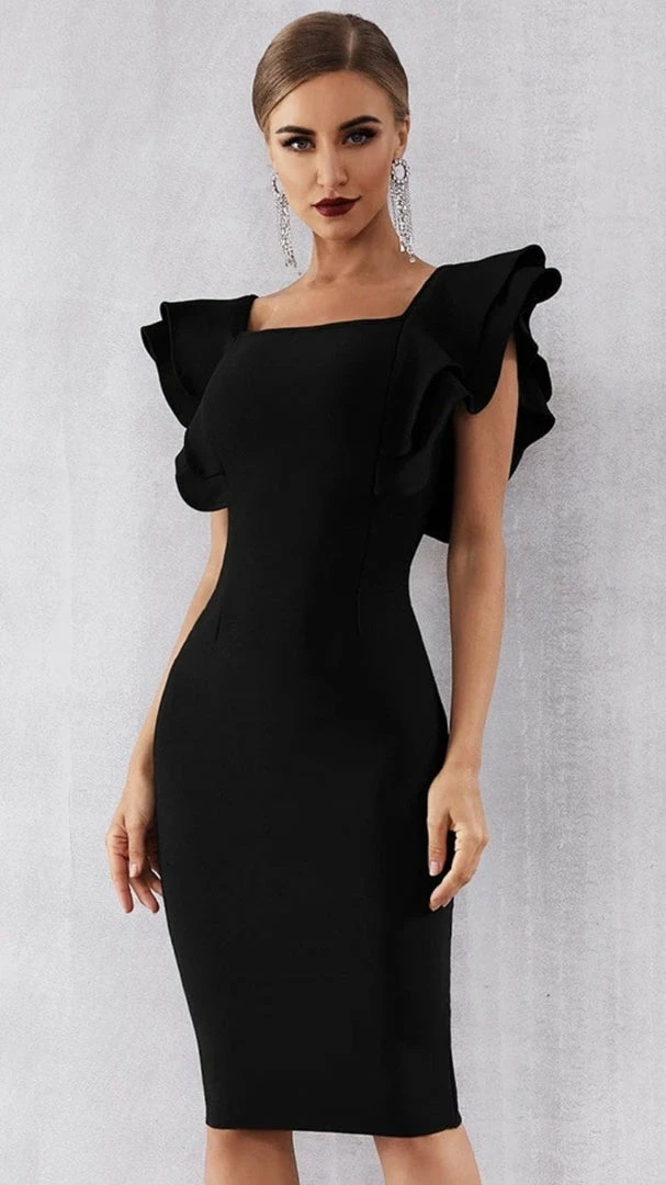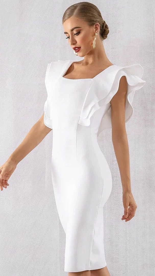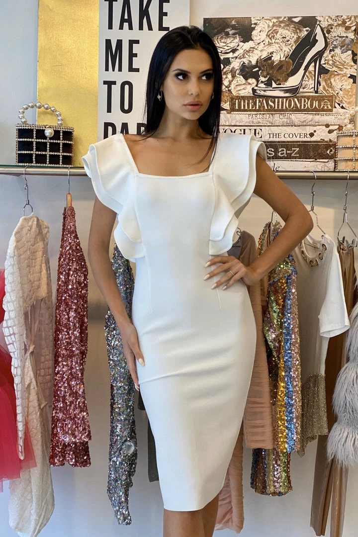Bandage is bang on trend right now and this dress is about to be a total hit! Featuring a flattering white bandage material, ruffles on the shoulders, and a midi length. Pair with clear heels and a statement clutch.