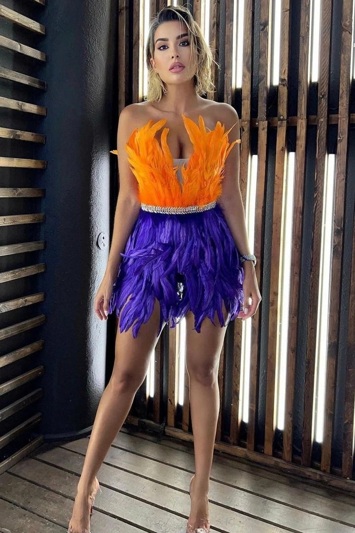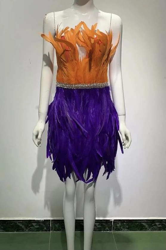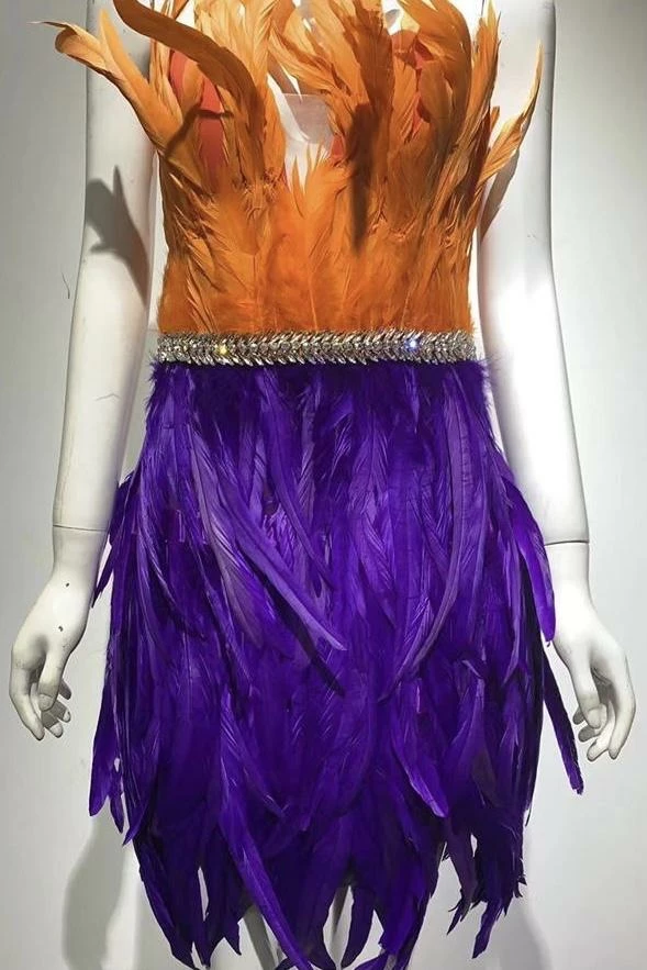 Make a bold statement this season. Featuring a fully feathered mini dress with orange and purple color contrasting parts and a crystal skirt belt detail. Add strappy heels and a slick back pony to bring the wow factor.
