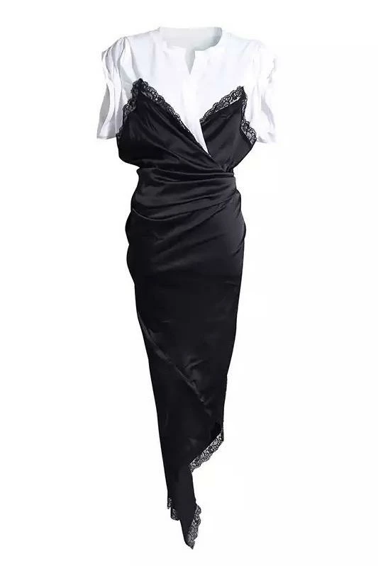 This stunning satin dress is hitting all the trends this season dolls. Featuring a sleeveless, slight v neck white t shirt sewn under a lace lined satin slip dress.. we’re obsessed. Pair this with toe thong heels, a large tote bag, and big sunglasses for the coolest outfit at your gals’ next brunch date!