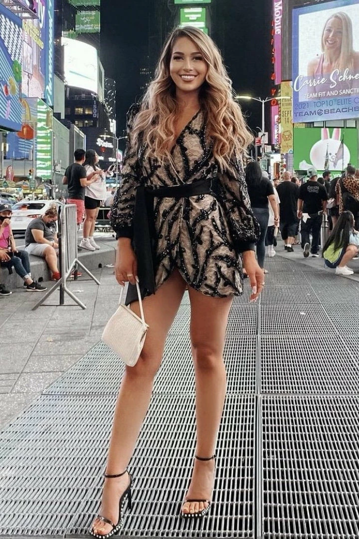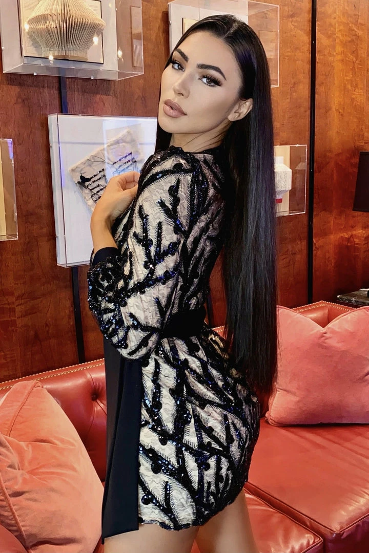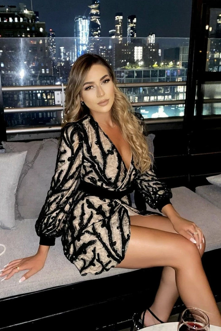 This dress is calling your name for this upcoming party season! Featuring a beautiful black and nude glitter material, long sleeves, deep v-neck, belted waist, and mini length. Pair with strappy black heels.