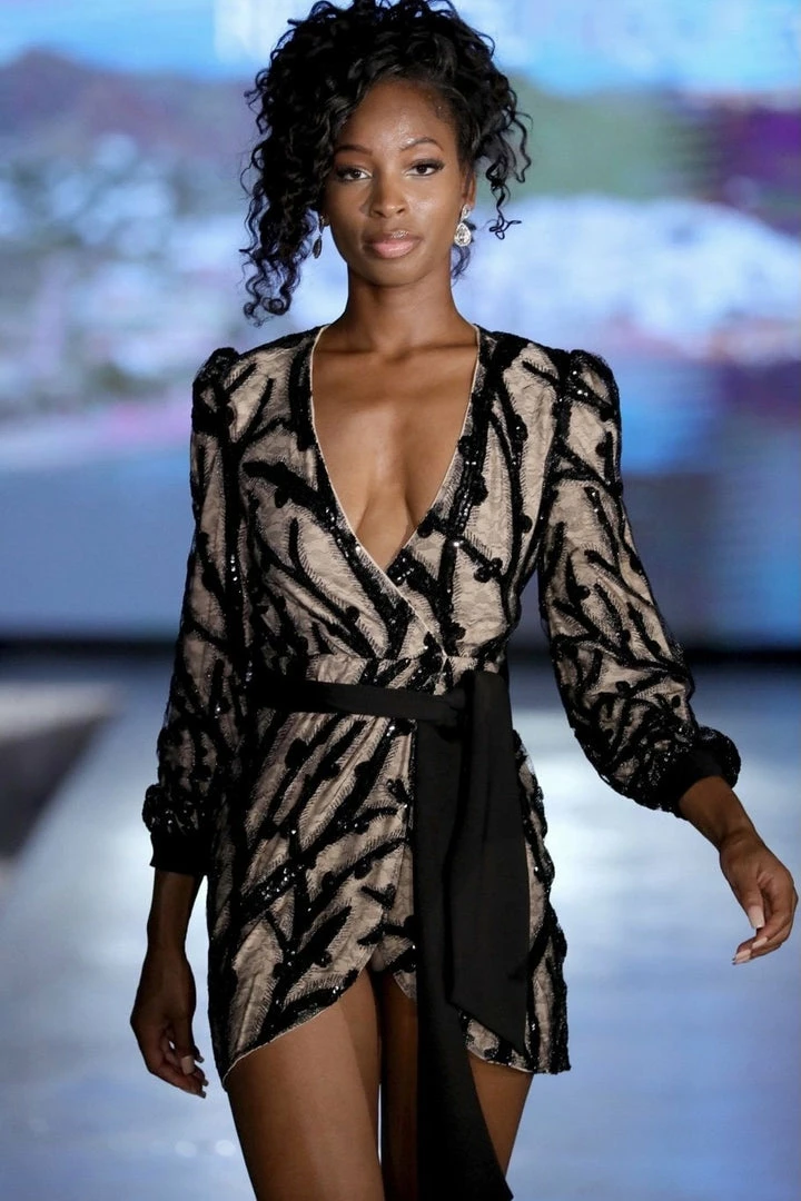 This dress is calling your name for this upcoming party season! Featuring a beautiful black and nude glitter material, long sleeves, deep v-neck, belted waist, and mini length. Pair with strappy black heels.
