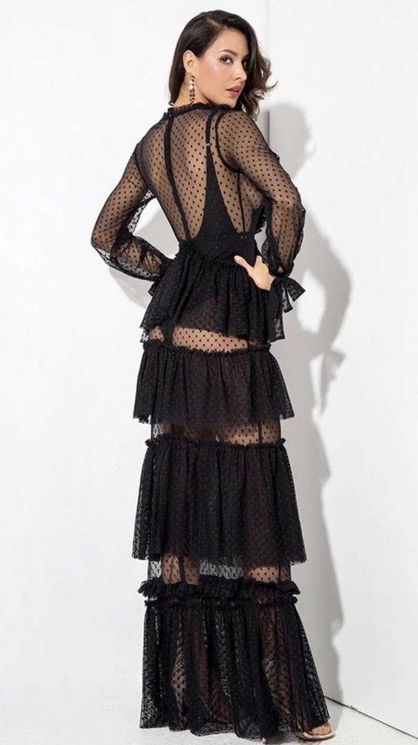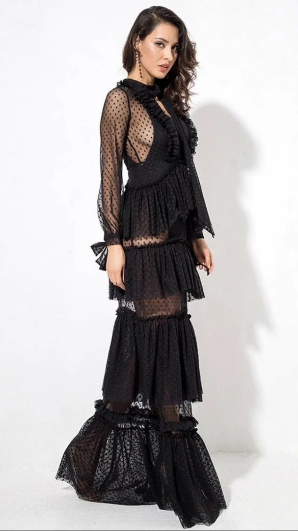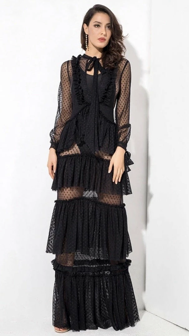 Amp up the drama in this fun and daring maxi dress. Including a dot mesh material, ruffles throughout, necktie, long sleeves, and a floor length style. Pair with nude heels.