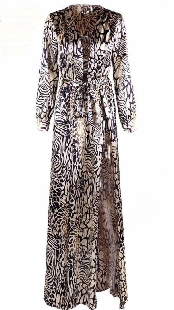 This dress is a perfect choice if you want to look effortlessly chic. The front plunges down into a deep-v neck and stops at the tie around the upper waist. It also includes a leopard print material, long sleeves, and a maxi length. Also perfect to throw on at the pool or beach.