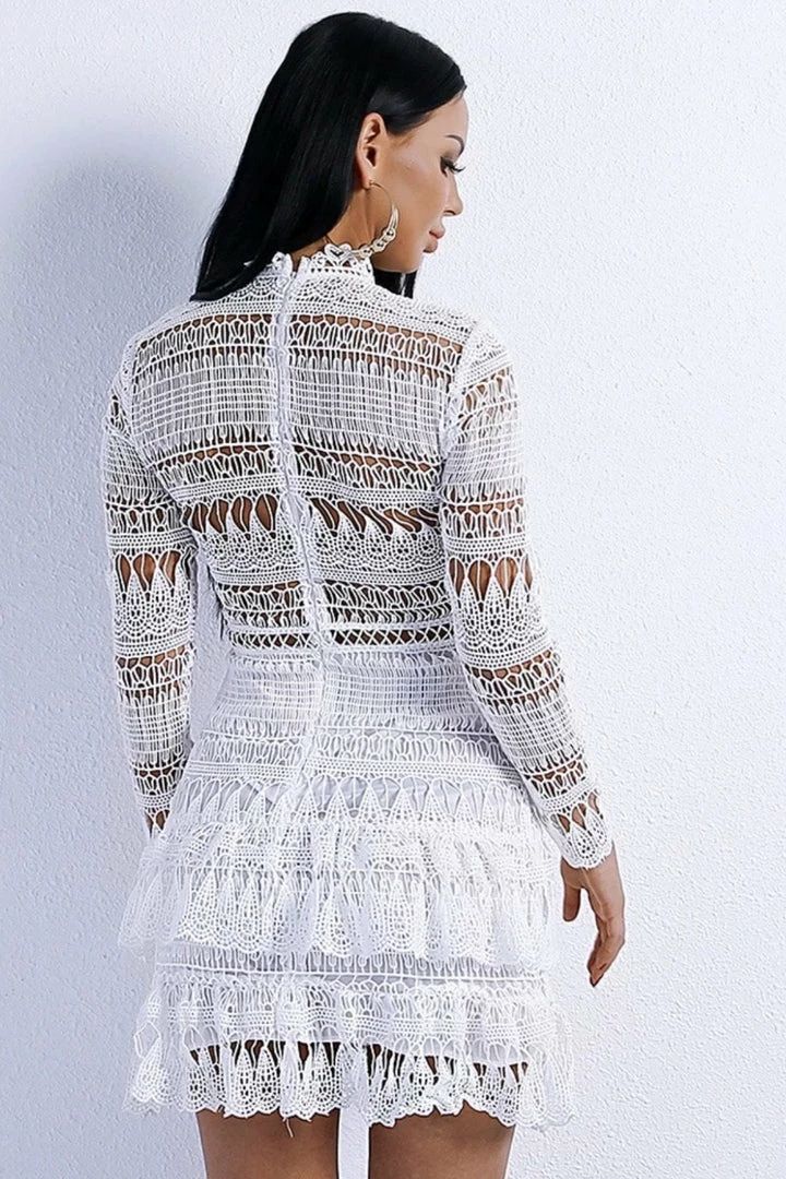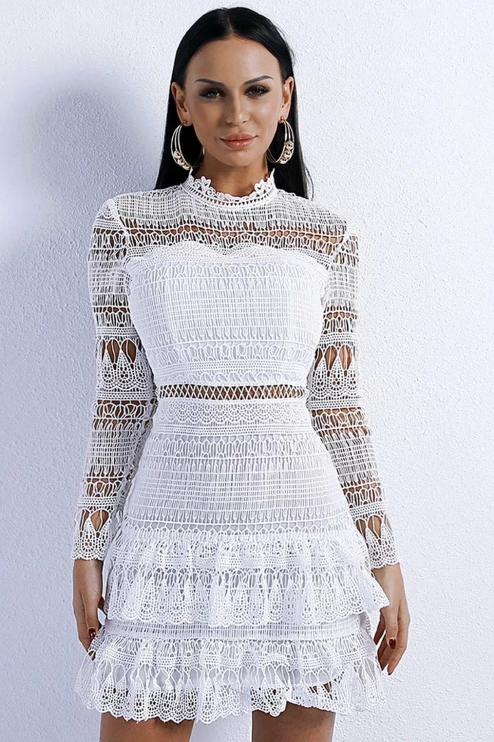 Look and feel super feminine yet sexy in this mini! Featuring a lace material, long sheer sleeves, high neckline, ruffle trim, and mini length. Pair with gold accessories and nude stilettos.