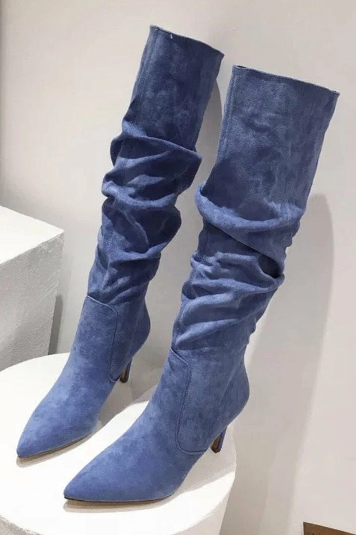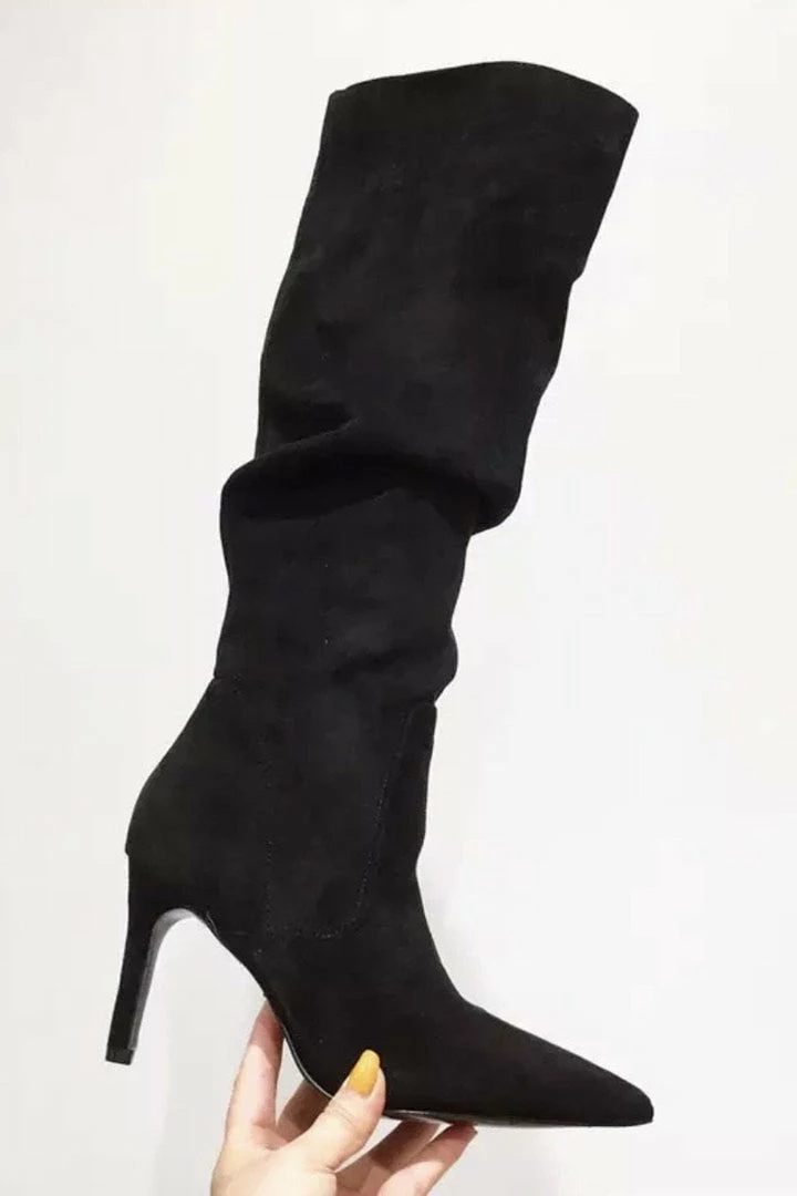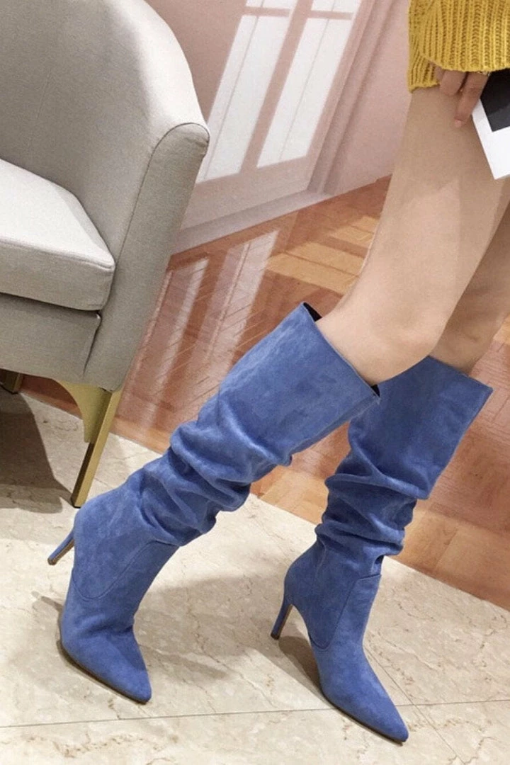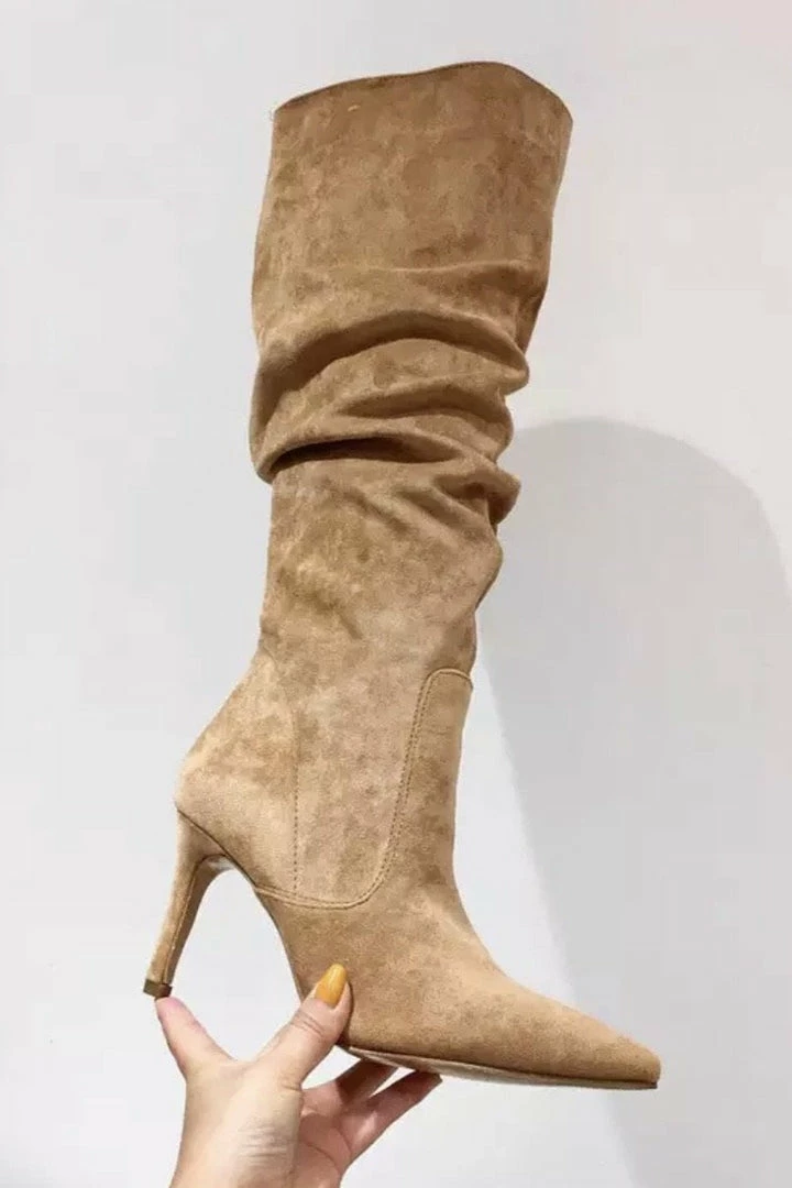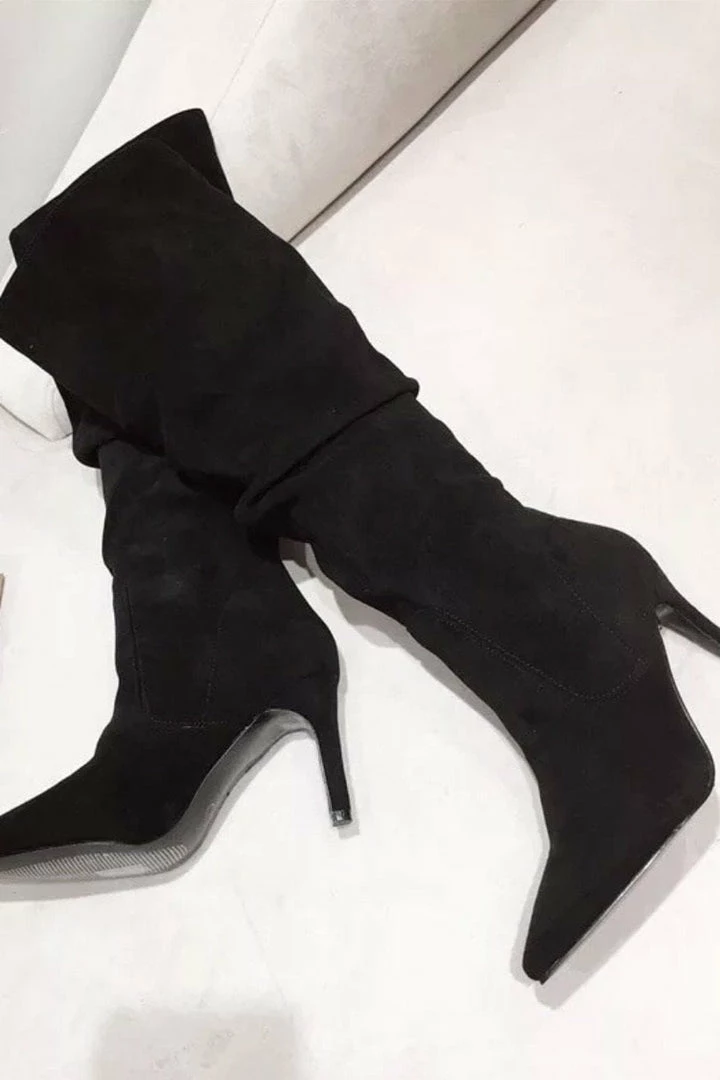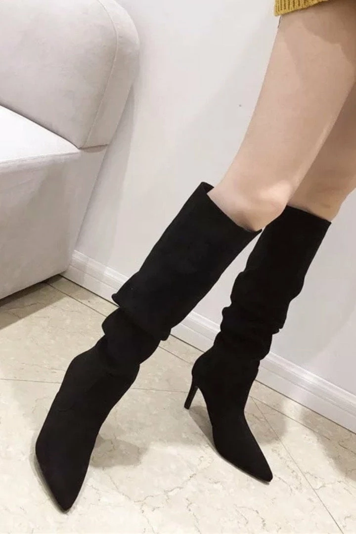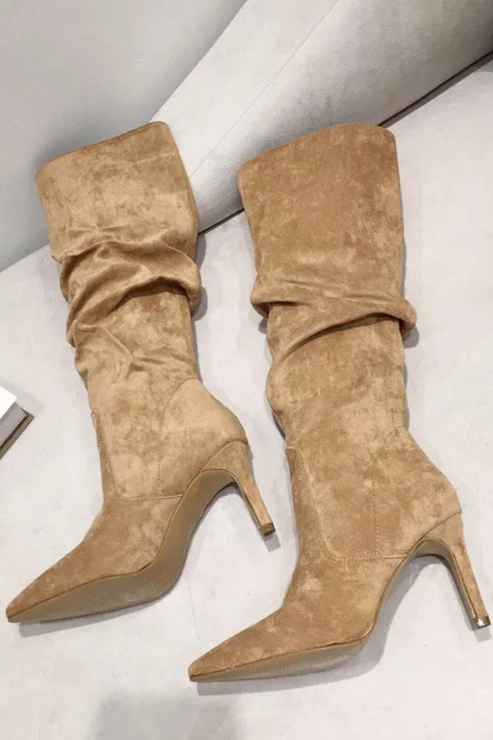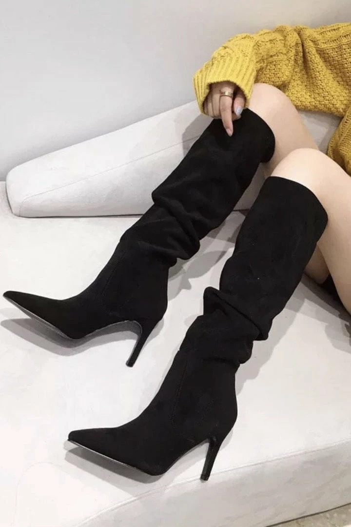 Take your look to new heights with these boots! Featuring a faux suede material with a knee high design, slouchy detail, and 3.3 in heel. Team these with your outfit of the day for a combo we are crushing on.