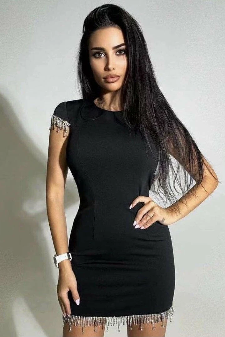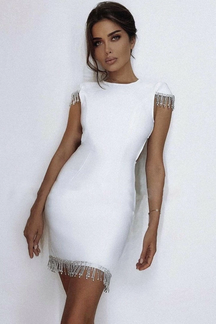 This bodycon dress is so sparkly and chic dolls. Featuring crystal fringe detailing along the shoulders and hem, sleeveless cap sleeve, and high neckline. Style with embellished heels and mini accessories for a simply stunning look!