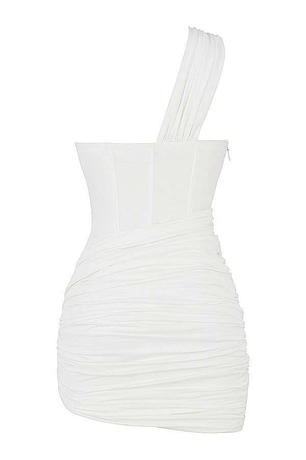 The little white dress you need in your closet. Featuring a mini length, a double strap one shoulder, and a ruched skirt style. Pair with strappy heels and gold hoops for your next all-white summer soiree!