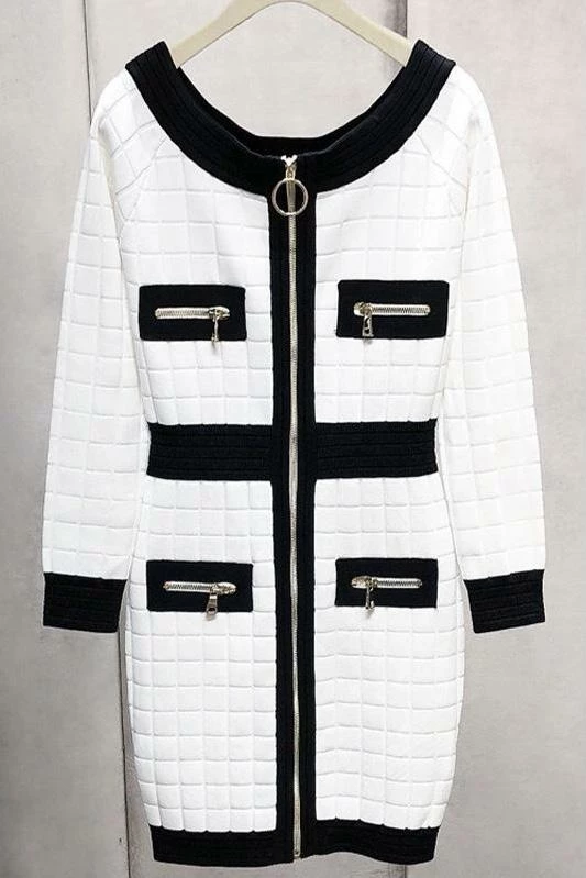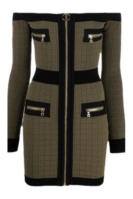 This is a staple piece for your fall wardrobe dolls! Featuring a long sleeve, off the shoulder mini dress with a bodycon knit material, a zip up fastening, and zipper details. Wear with an oversized blazer to work or pair with ankle strap heels on date night for a look we love!