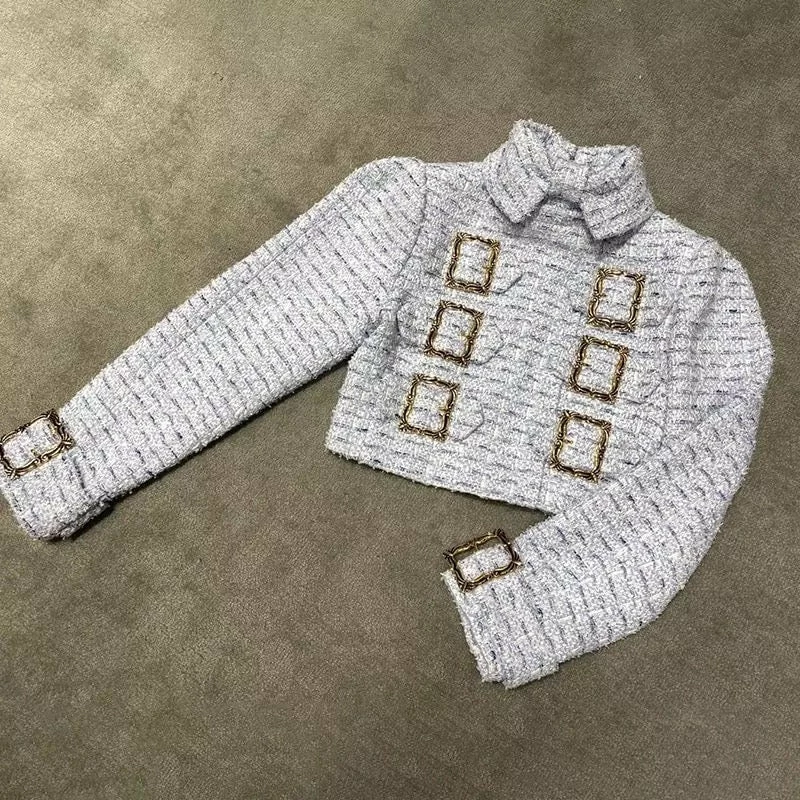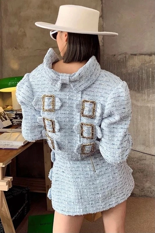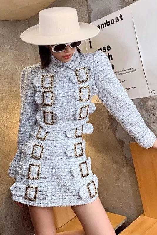 This two piece set will have you looking seriously chic! Featuring a long sleeve, collared, buckle top with a fuzzy knit material and a matching high waisted mini skirt. Team with high knee boots and add glamorous accessories to look like you just came off the runway!