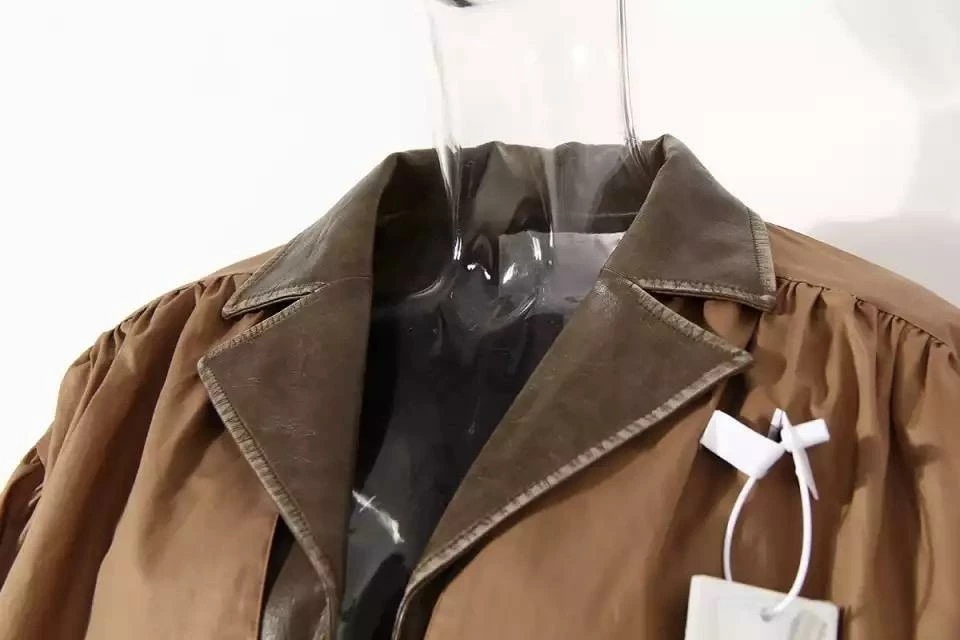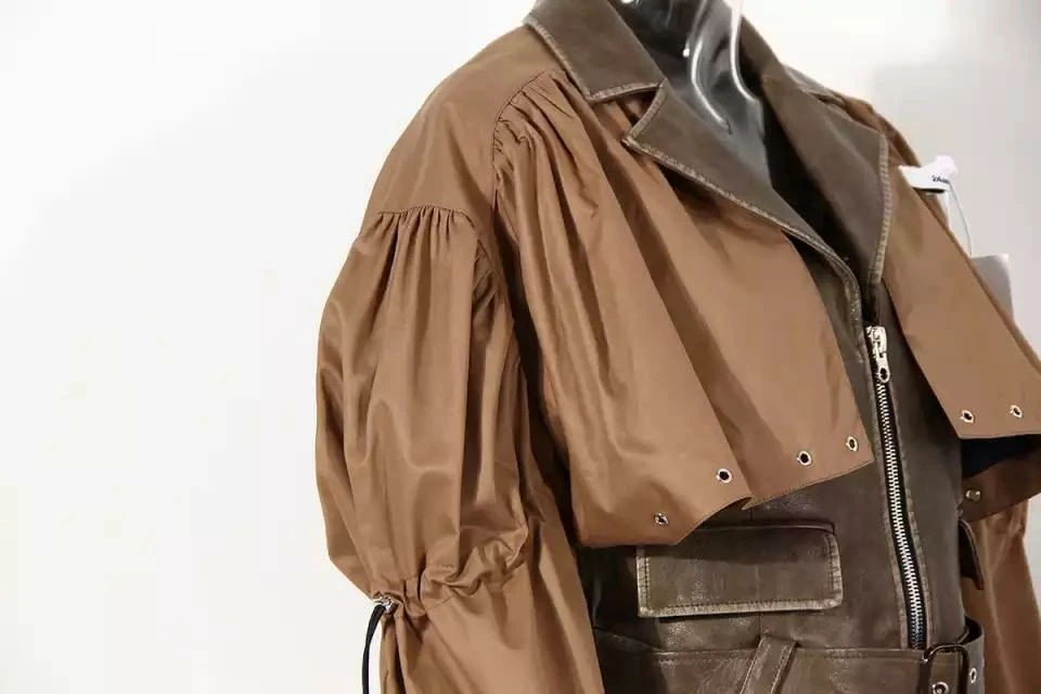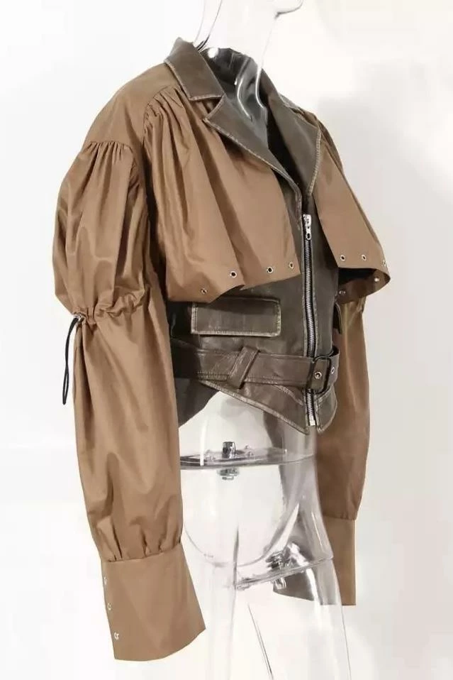 Amp up your outerwear this season with this totally unique look! Featuring a patchwork jacket with nylon long sleeves and oversized lapel, a faux leather body and collar, an attachable belt, and a synching detail along the arms. Throw over any look this season to add an element that will make you do a double take!