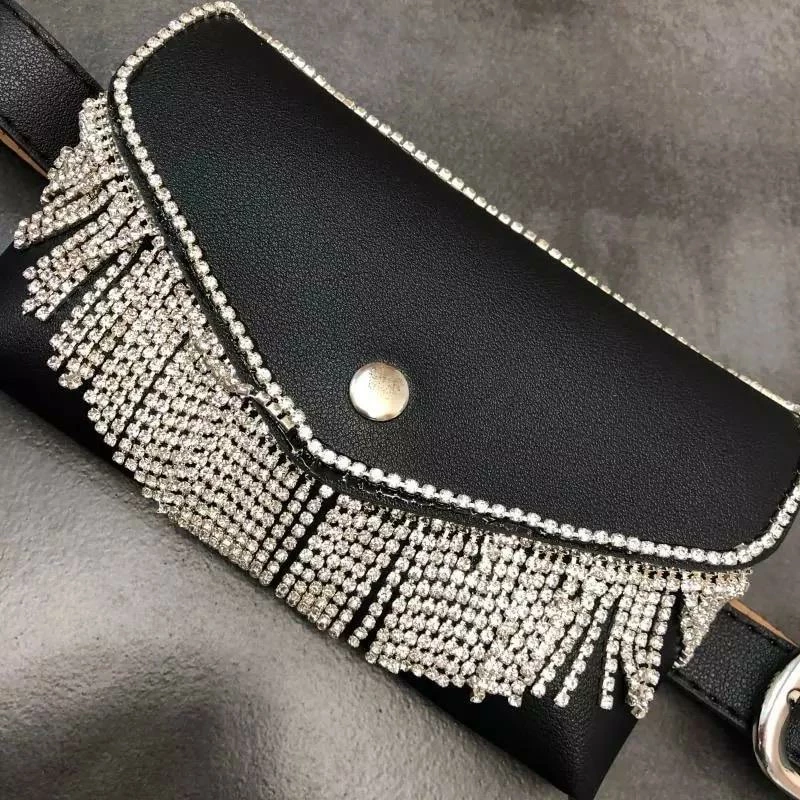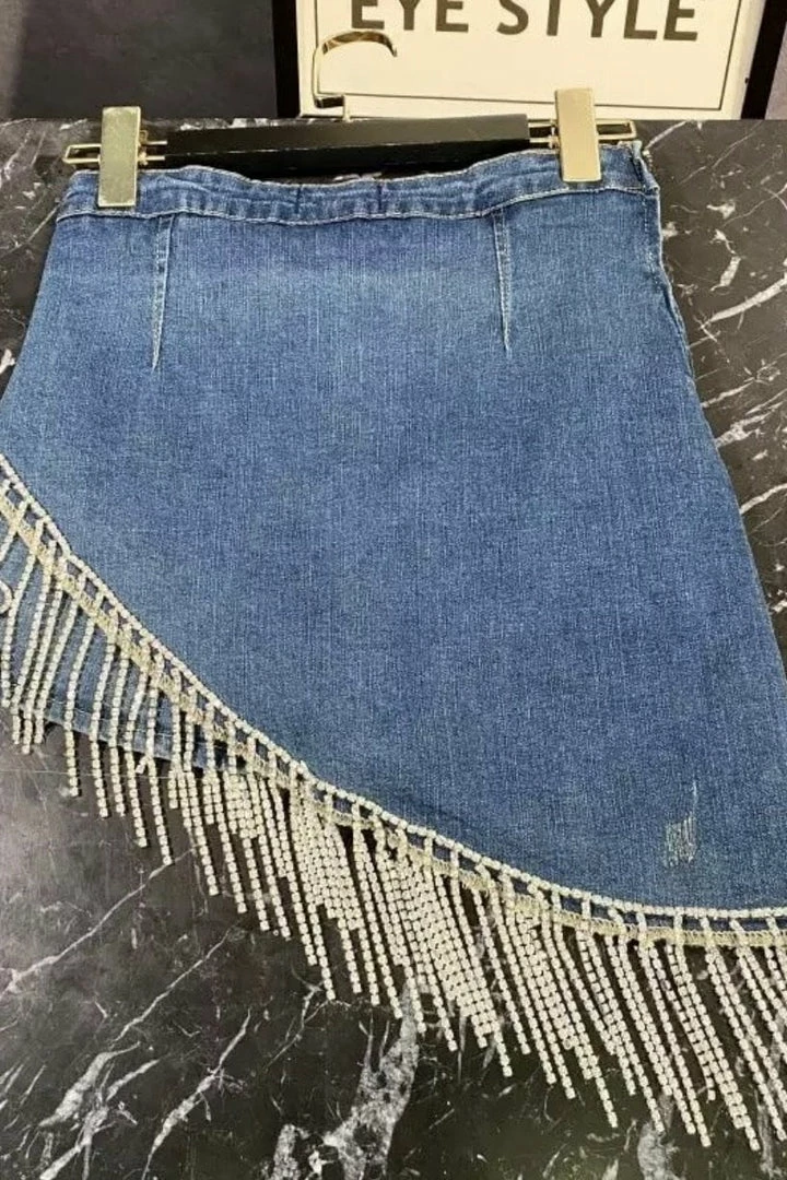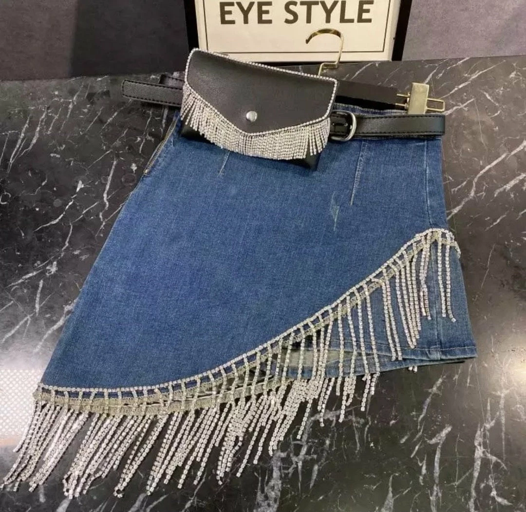 We’re crazy for this high waist, denim, diagonal cut, diamond fringe mini skirt. Includes a black belt with a matching diamond fringe coin purse. This is the perfect skirt for concerts, raves, parties, or to let loose out on the town.