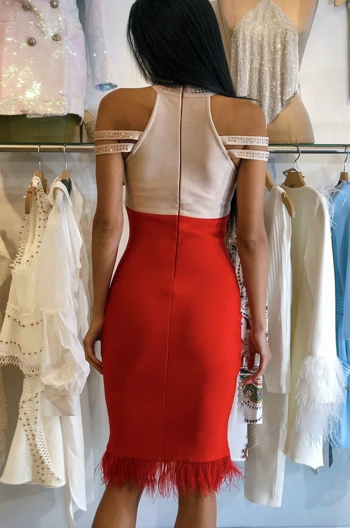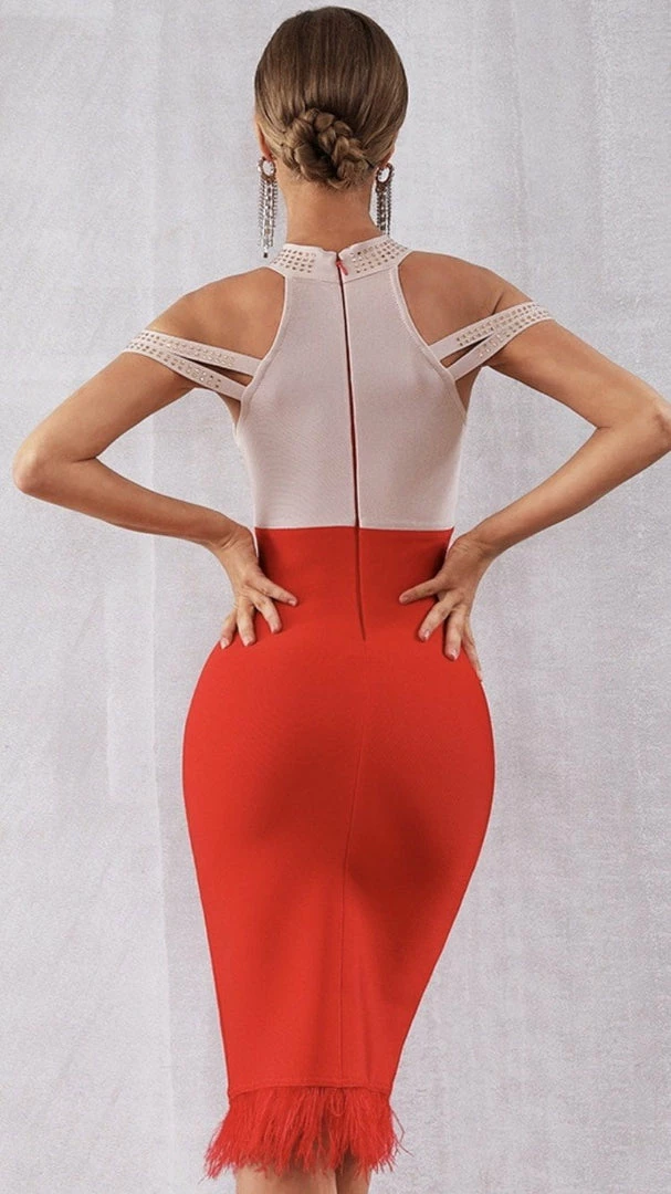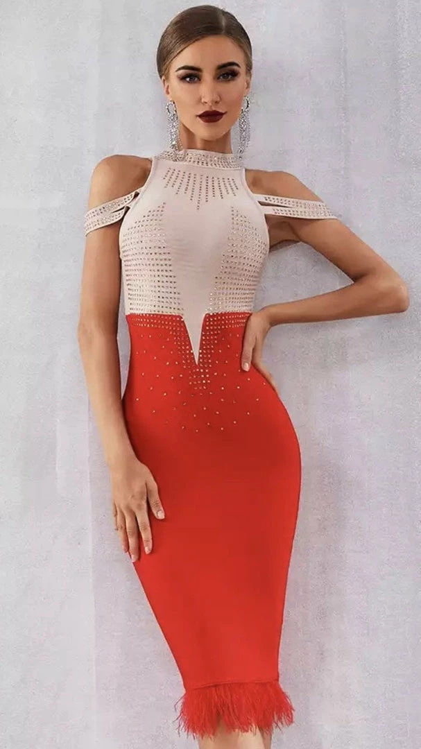 Our ‘Matilda’ dress features a midi length, rhinestones, an off the shoulder detail, feathers, and a high-neck style. Pair with rhinestone heels for your next date night.