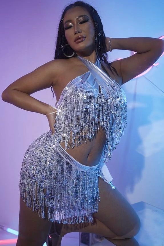 Go extra or go home! This dazzling two piece set features a criss cross halter crop top with sequin fringe detailing and a matching wrap skirt. Style with big hoop earings and ankle strap silver heels for your next birthday, festival, or trip to Vegas!
