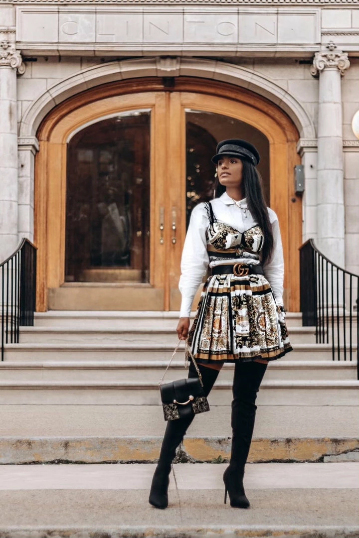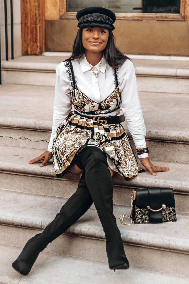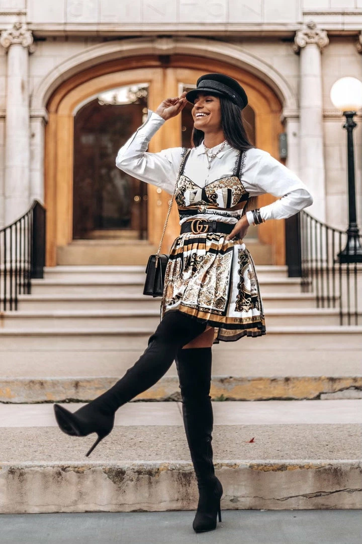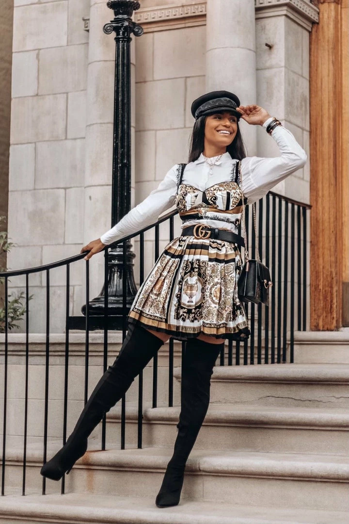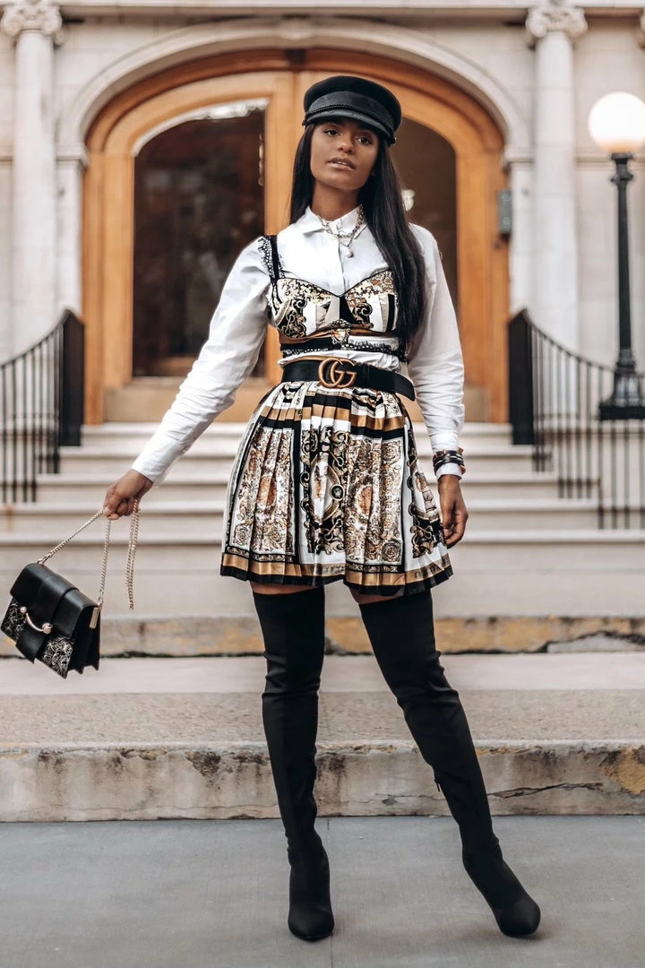 We are obsessing over this printed design. Including a yellow, white, and black printed crop top with a matching pleated mini skirt, this outfit is all you need to add some luxe into your life. Style with some killer heels and you are out the door! For summer to fall outfit inspo look to @koolkelsey on instagram modeling our piece over a white, collared long sleeve button down, black thigh high boots, and a black conductor hat.