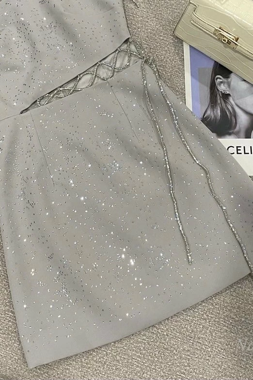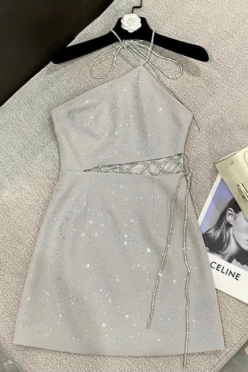 Elevate your weekend look in this dreamy dress. Featuring a halter neck style, lace up side details, and a glittery material – what’s not to love? Pair with a sparkly handbag and rhinestone earrings to outshine the crowd.