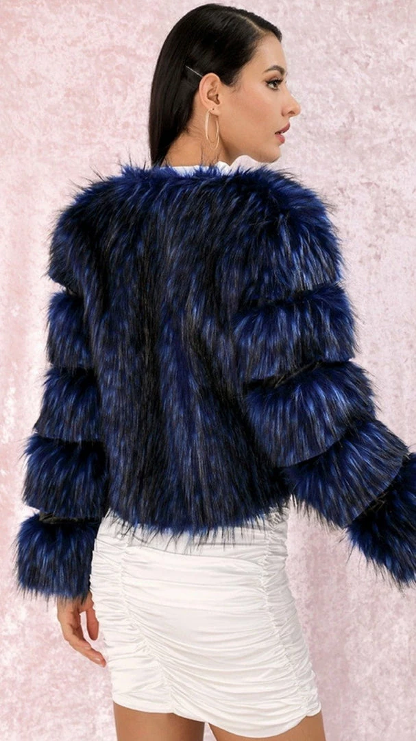 We are obsessing over this faux fur beauty! Featuring navy striped faux fur and a cropped fit. We love wearing ours with light denim boyfriend jeans and black booties.