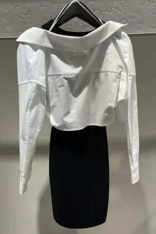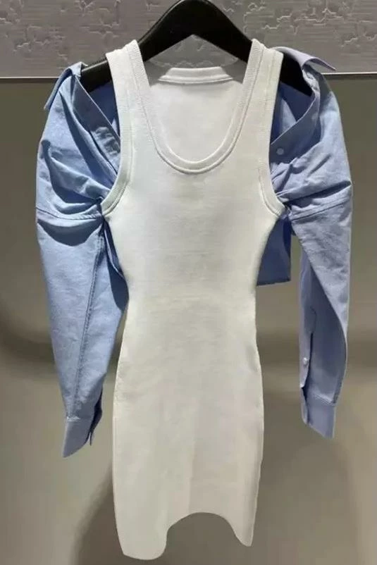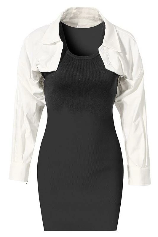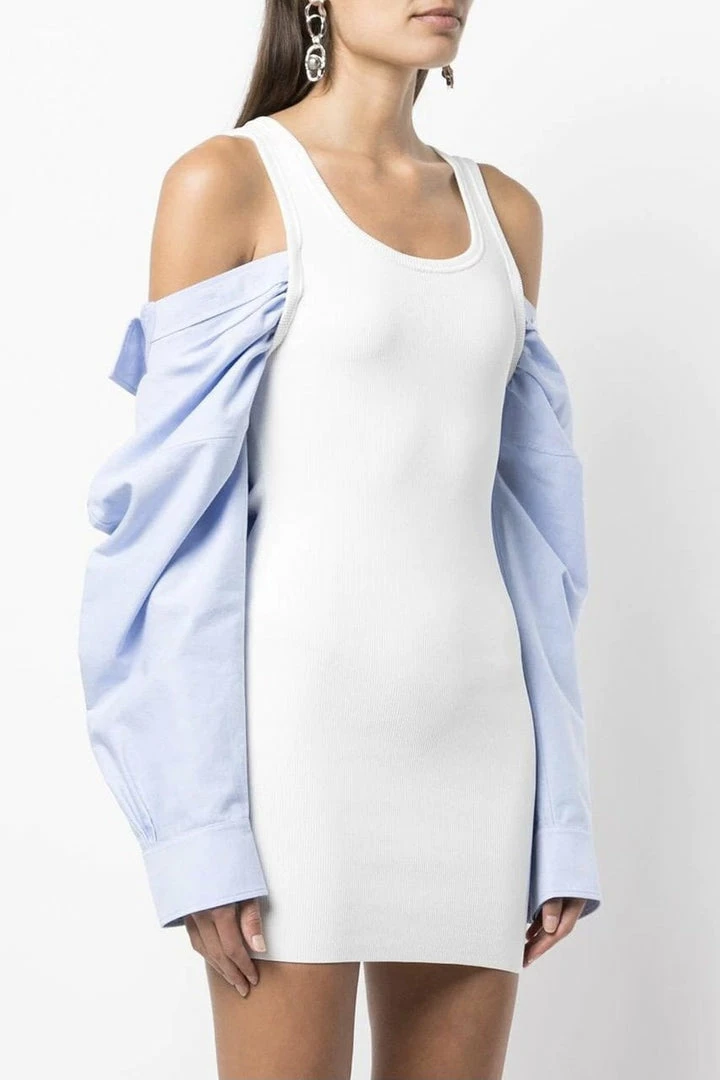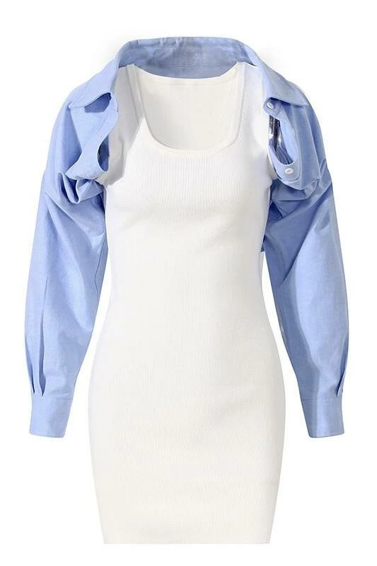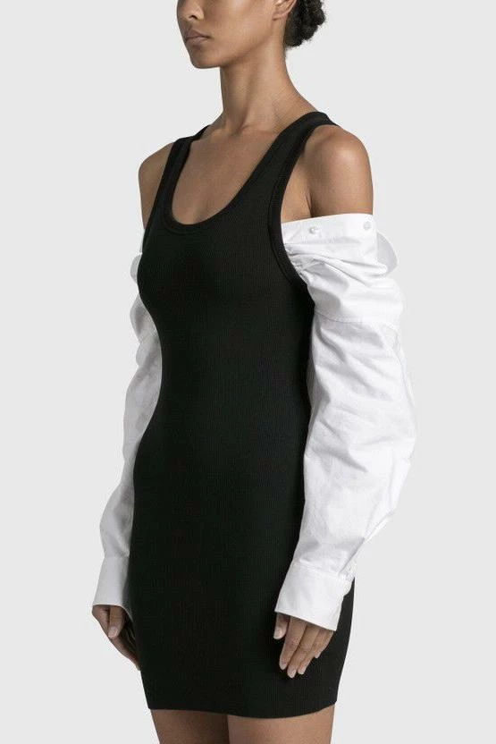Make a statement this season in this unique piece. Featuring a knit, swoop neck, tank top dress with a button down, long sleeve top under the dress sleeve and worn as an off the shoulder look. Pair with knee high heeled boots and a medium hang bag to hit the streets in style.