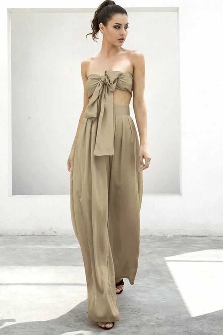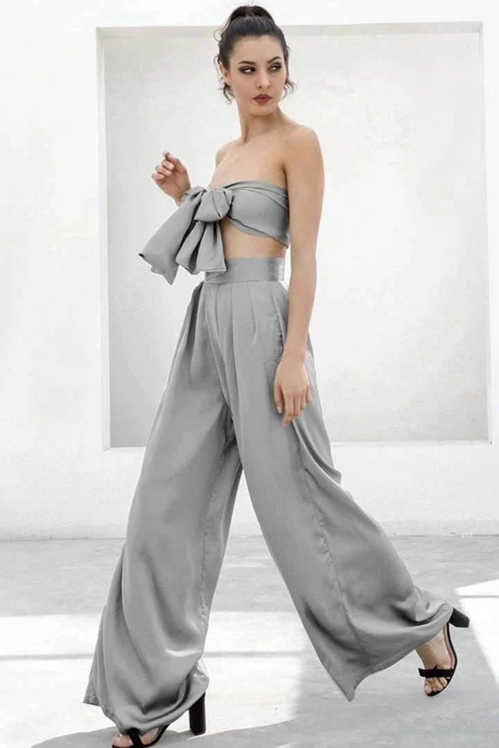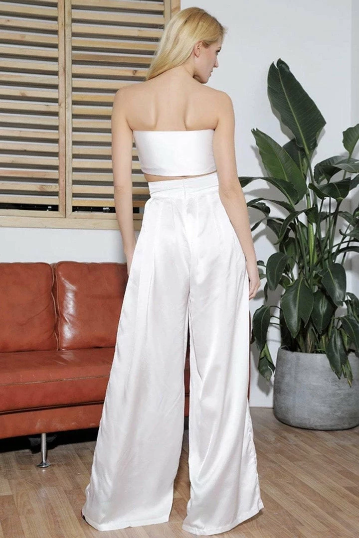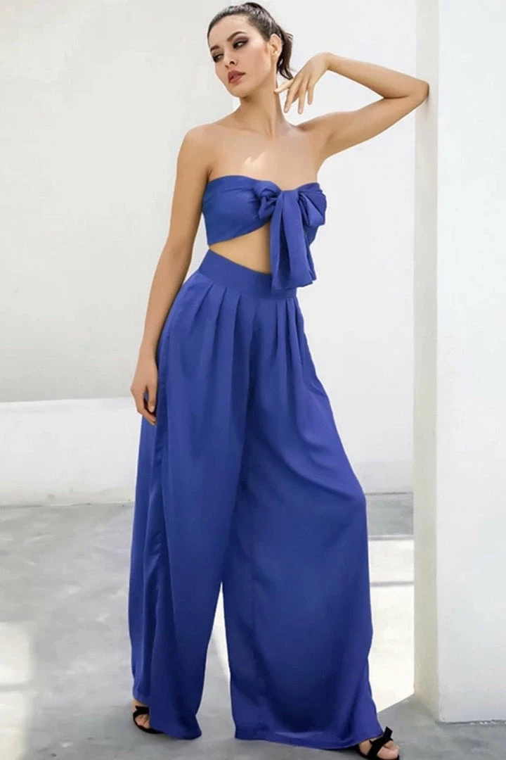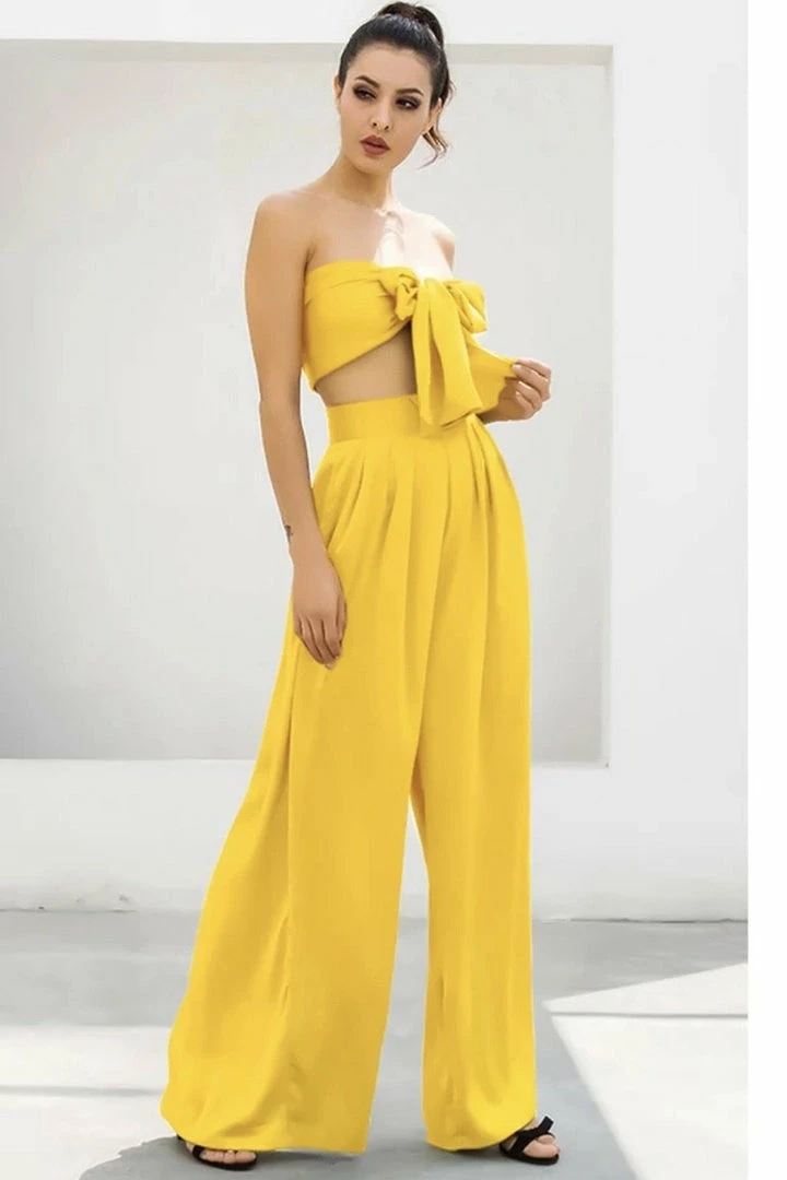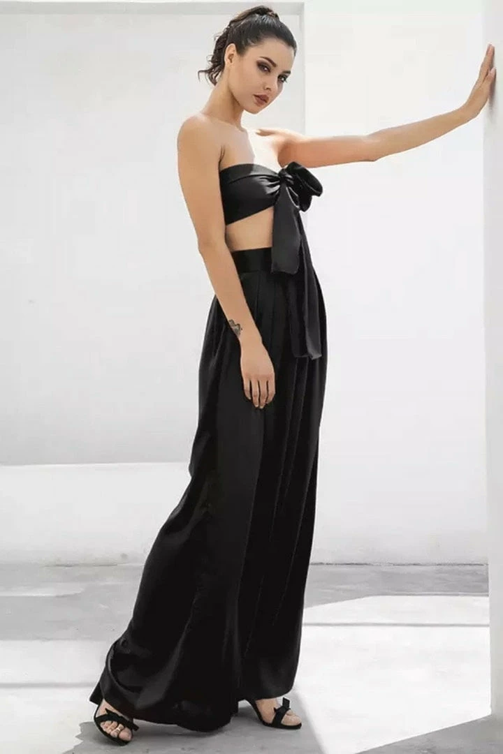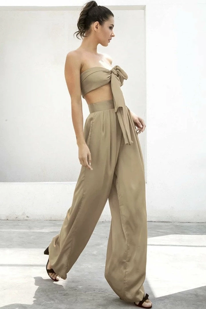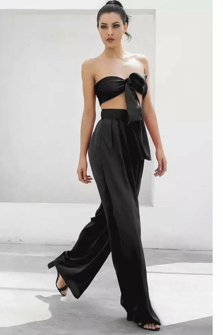 Look effortlessly chic in this set. Featuring a strapless crop top with a tie detail, and matching high waisted pants with a wide leg style. Pair with statement earrings and heels!