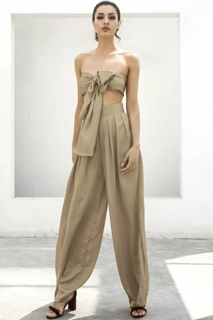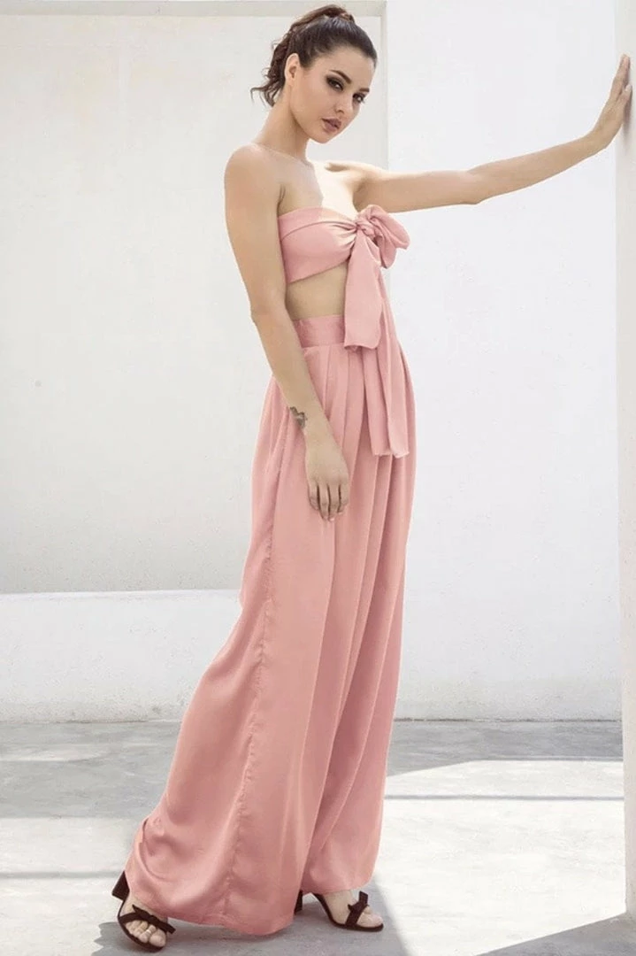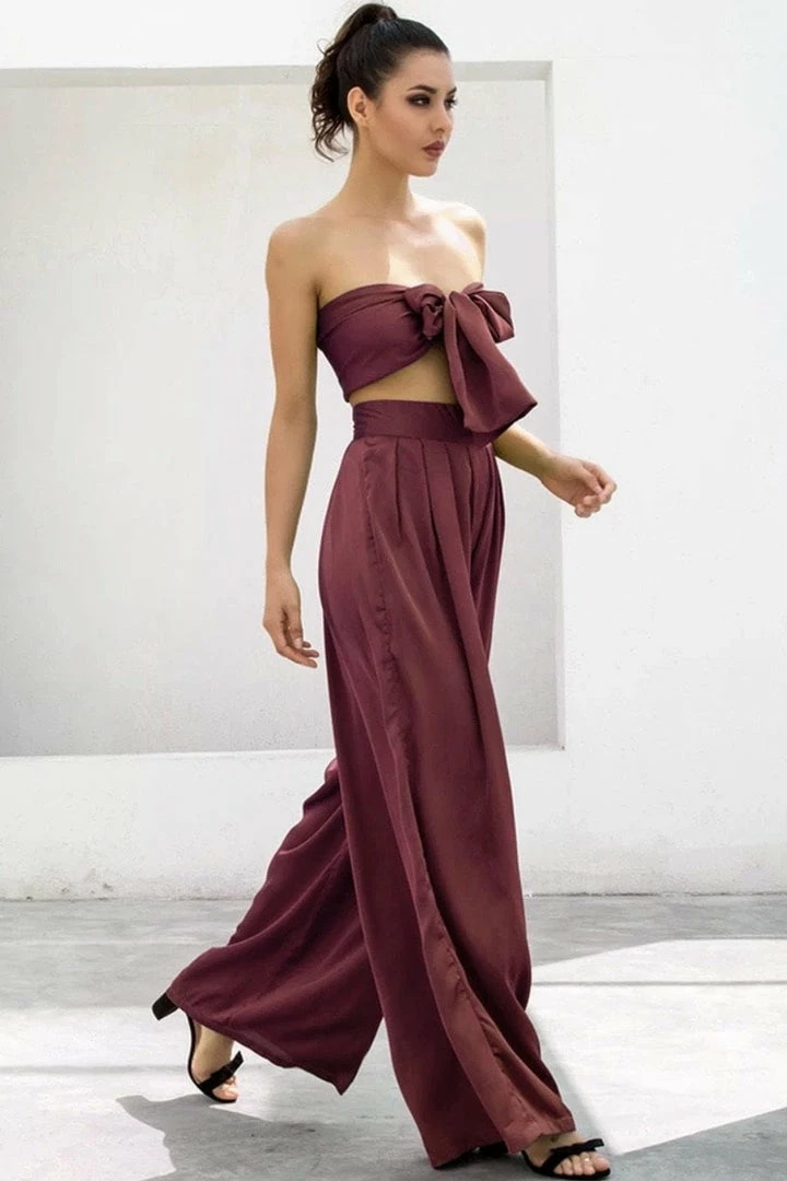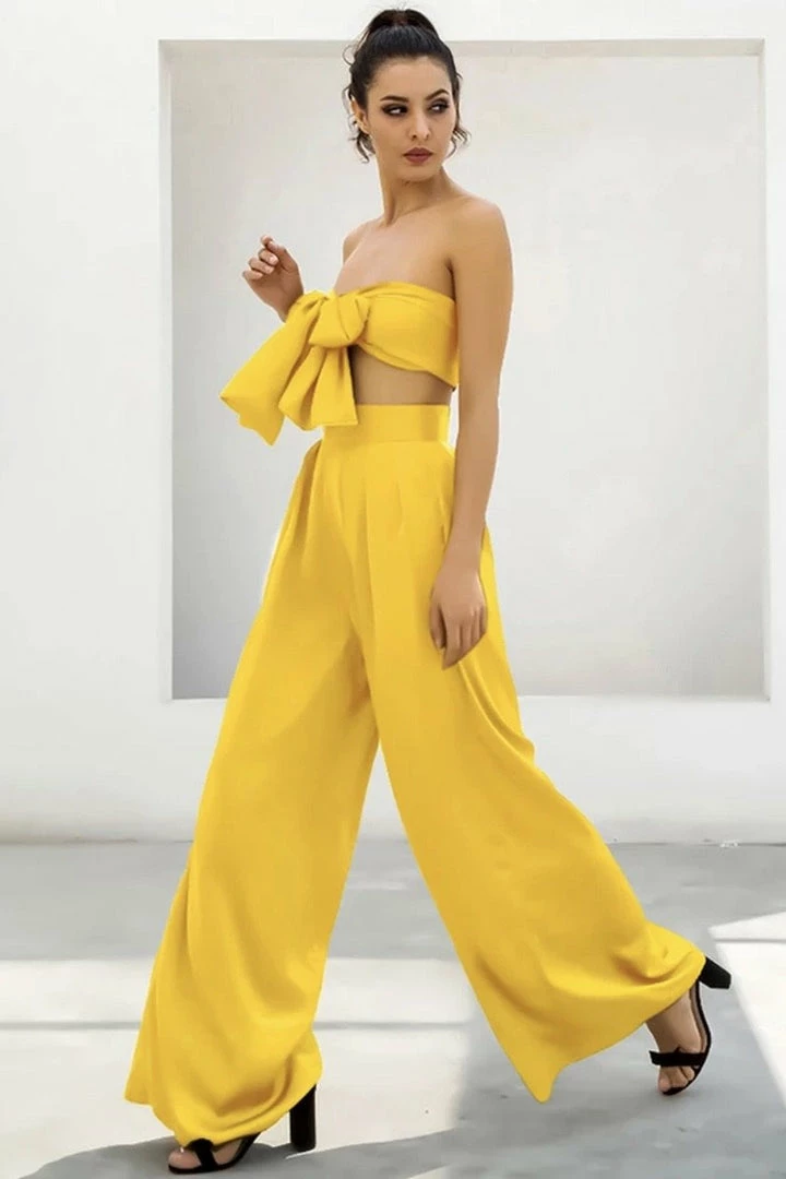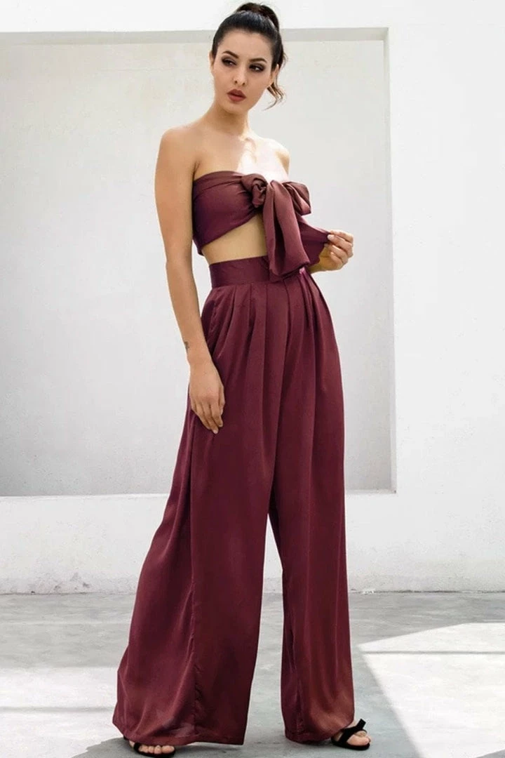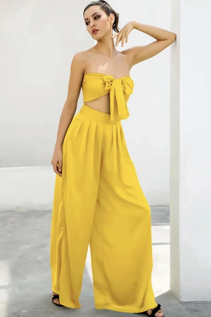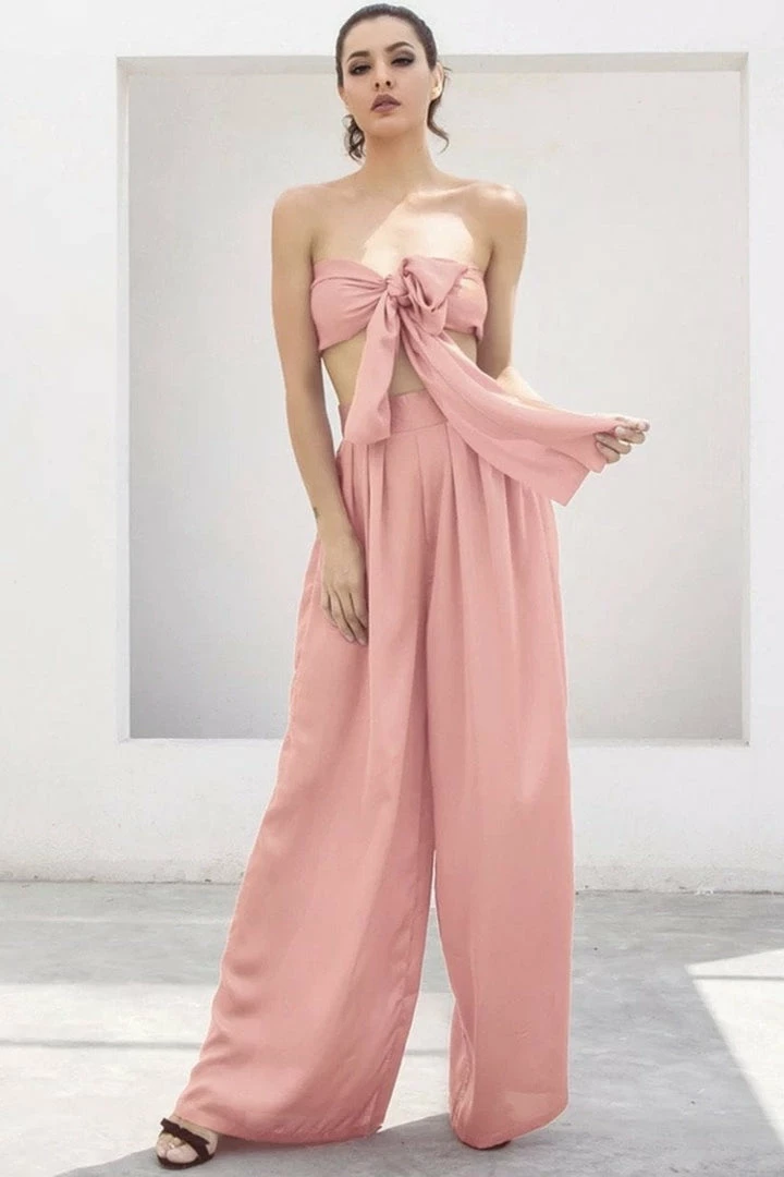 Look effortlessly chic in this set. Featuring a strapless crop top with a tie detail, and matching high waisted pants with a wide leg style. Pair with statement earrings and heels!