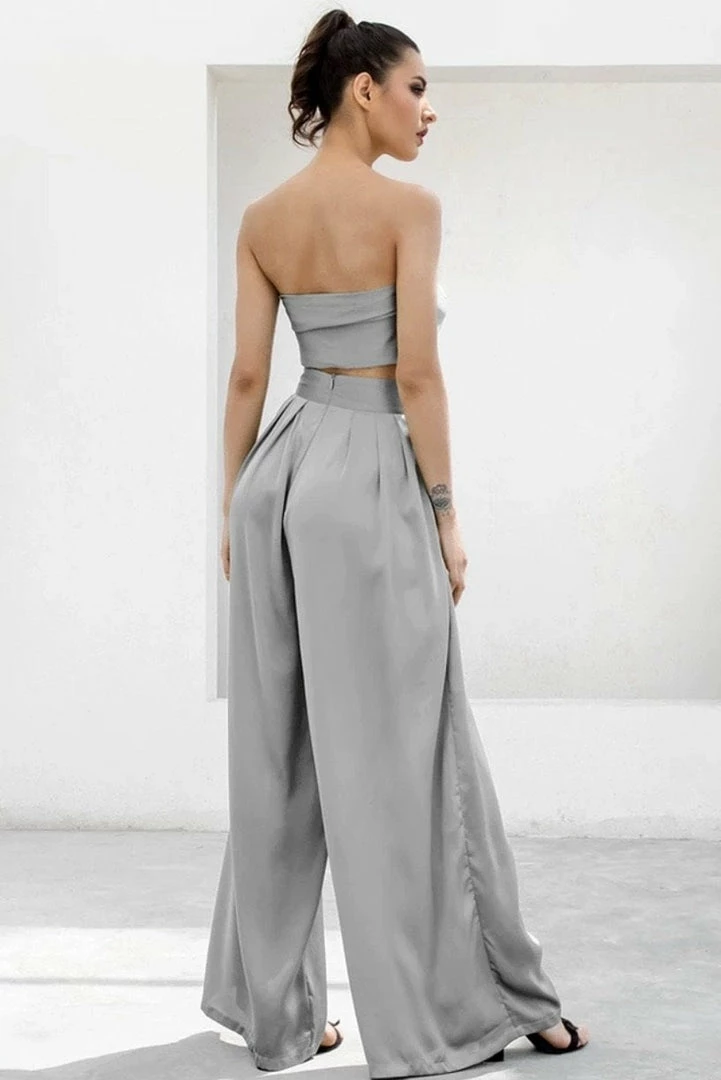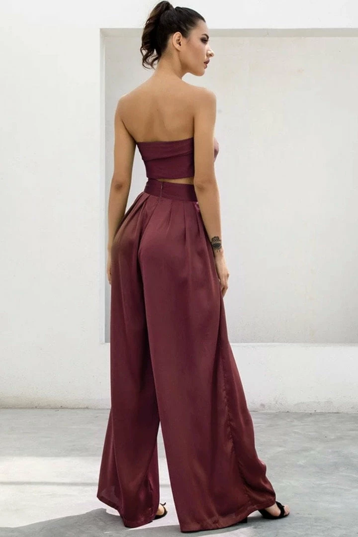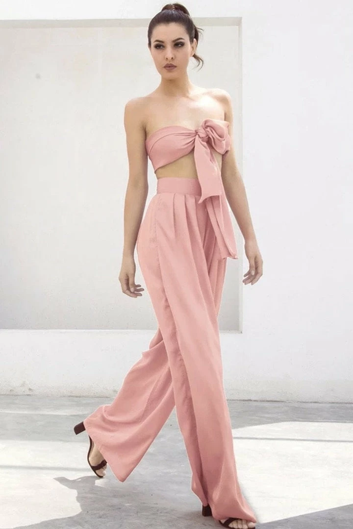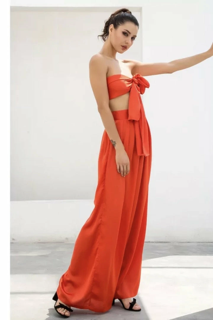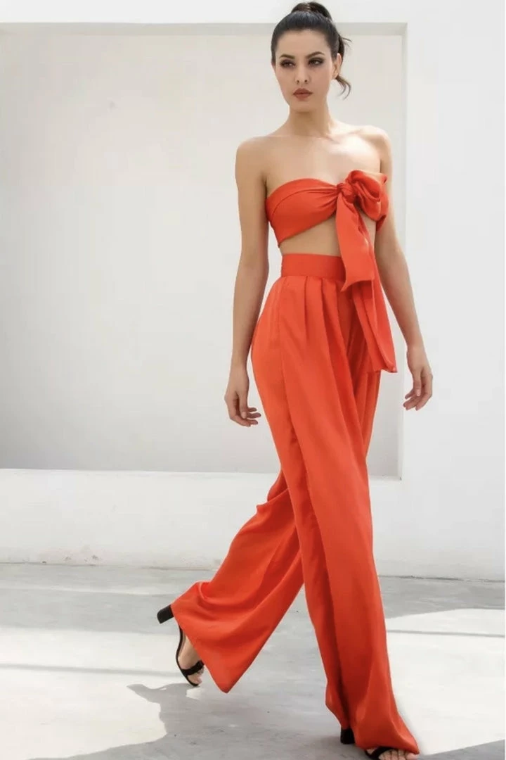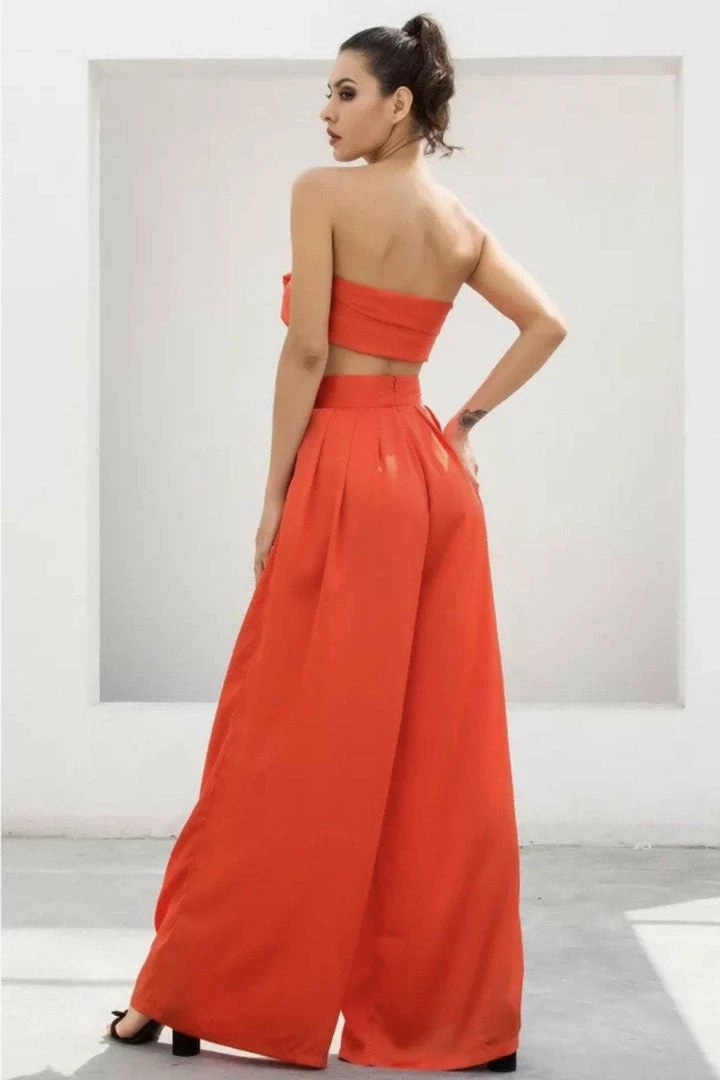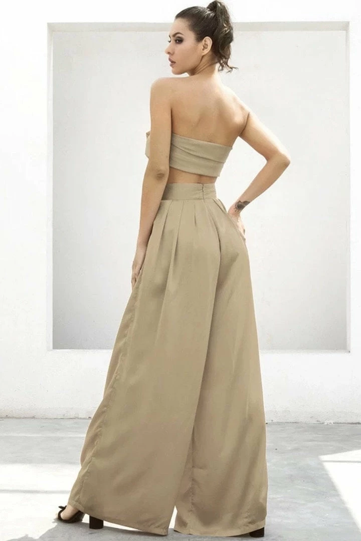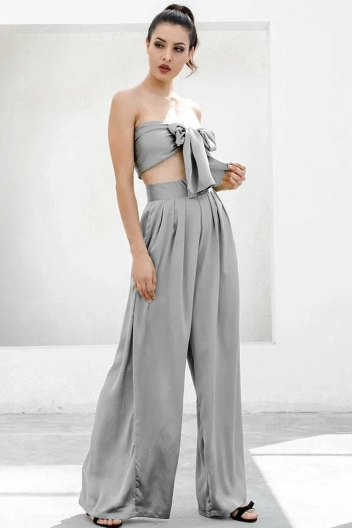 Look effortlessly chic in this set. Featuring a strapless crop top with a tie detail, and matching high waisted pants with a wide leg style. Pair with statement earrings and heels!
