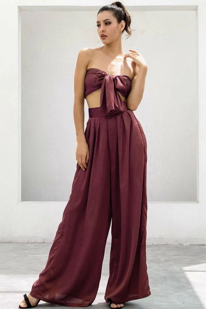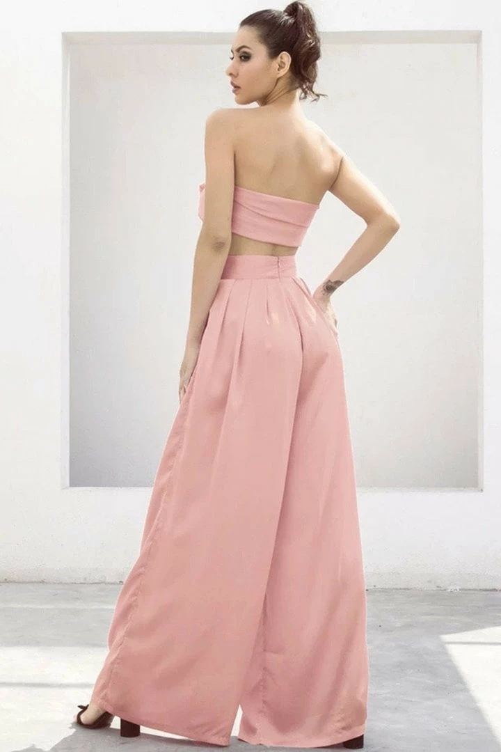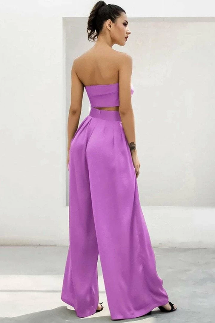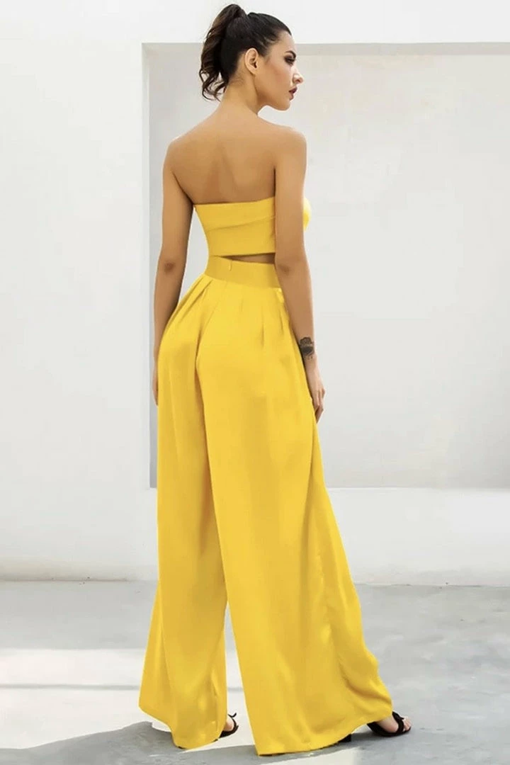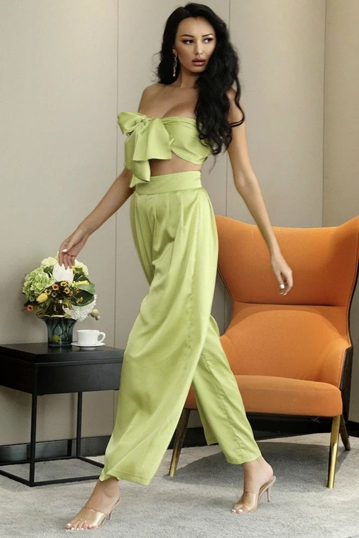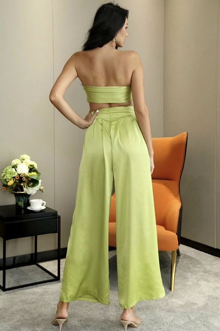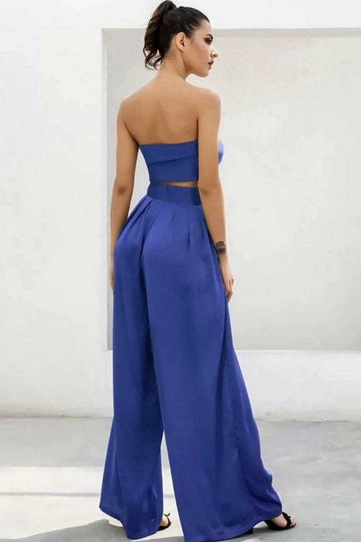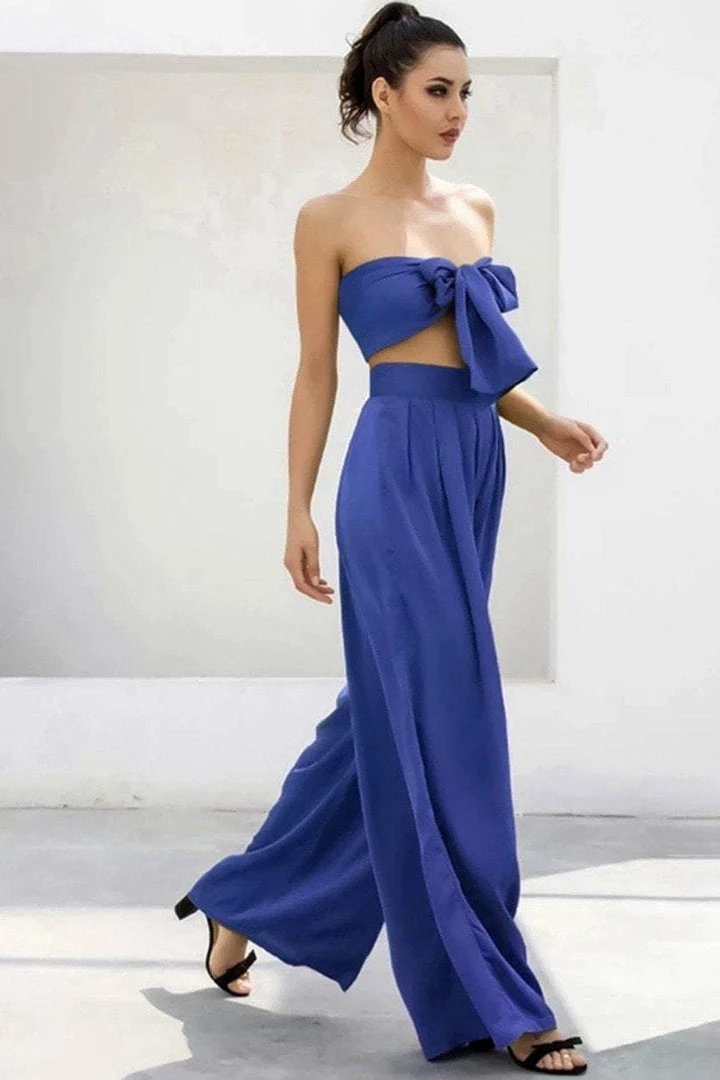 Look effortlessly chic in this set. Featuring a strapless crop top with a tie detail, and matching high waisted pants with a wide leg style. Pair with statement earrings and heels!