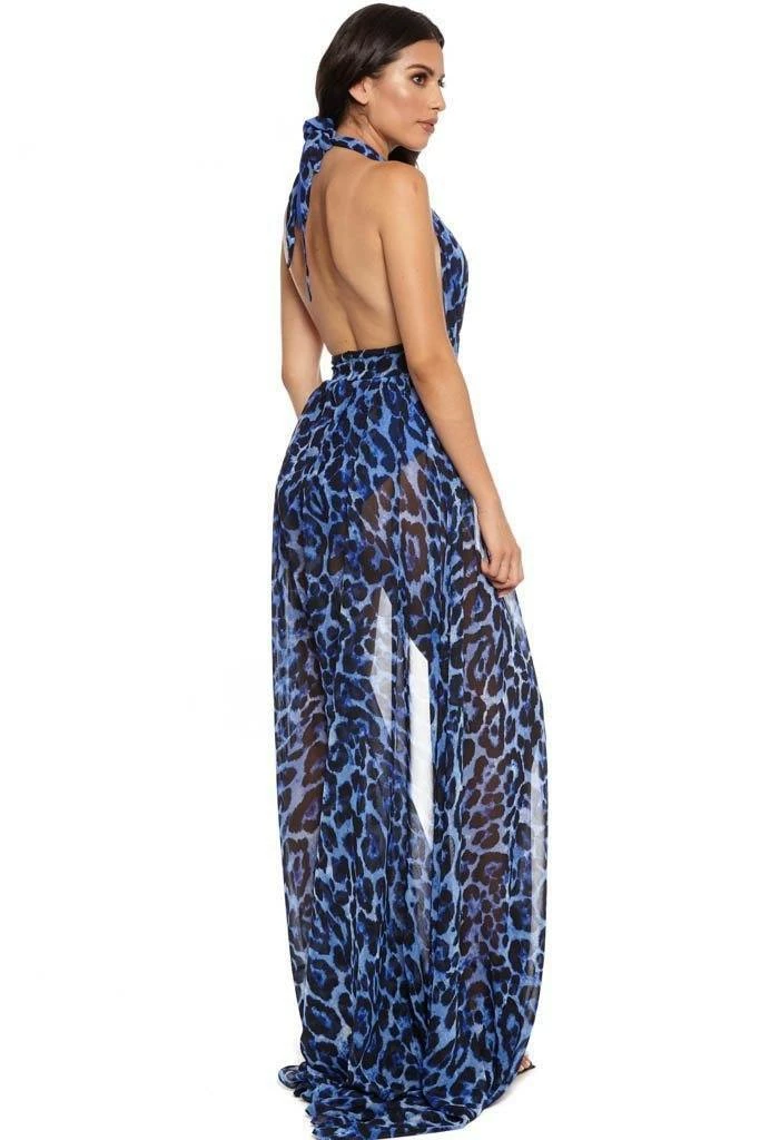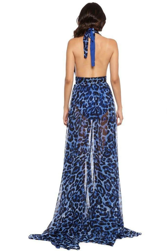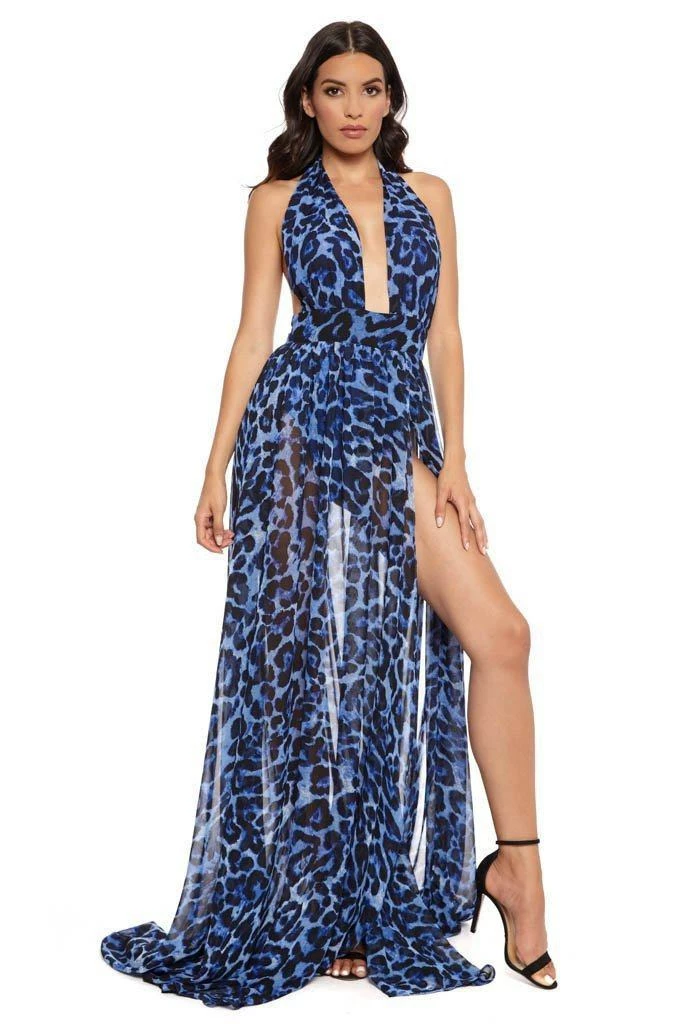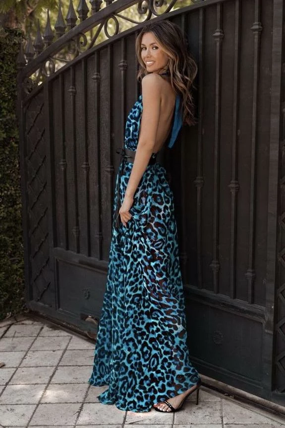 The Jessica Bara Mila Long Halter features a plunge line that stops at the waistline to accentuate your figure. With a semi sheer animal print polyester chiffon and a high slit on one side. This can be worn to a summer party.
