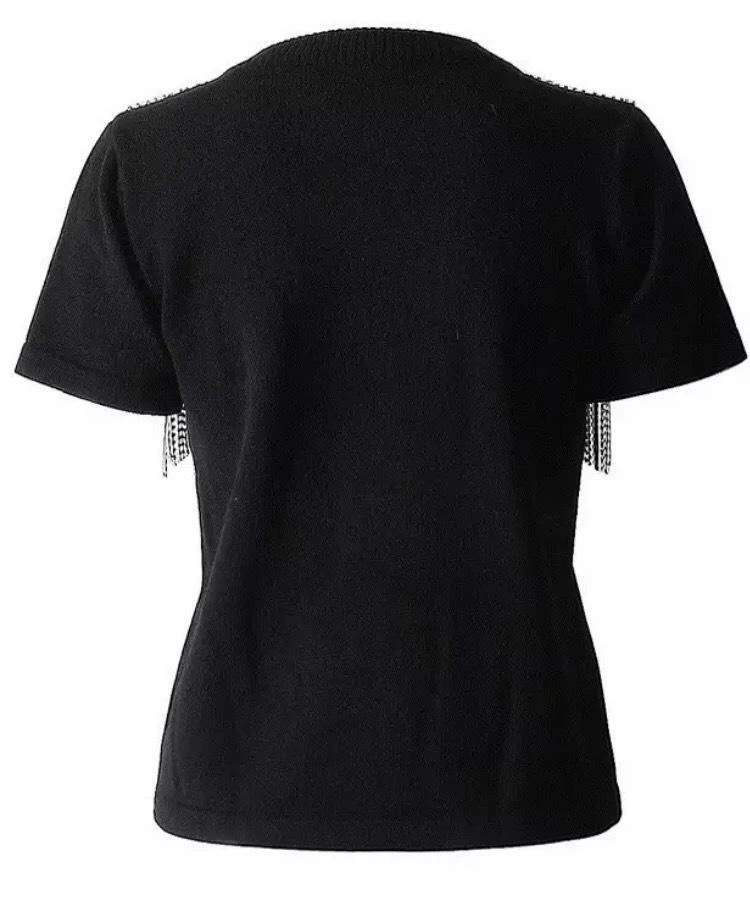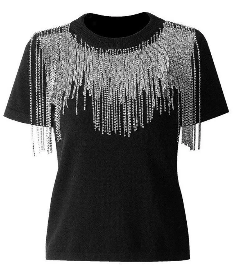 Edge up your look with our ‘Mina’ top. Featuring a chain tassel detail on the front, short sleeves, and round neckline. Pair with a faux leather skirt and booties for a fun look!