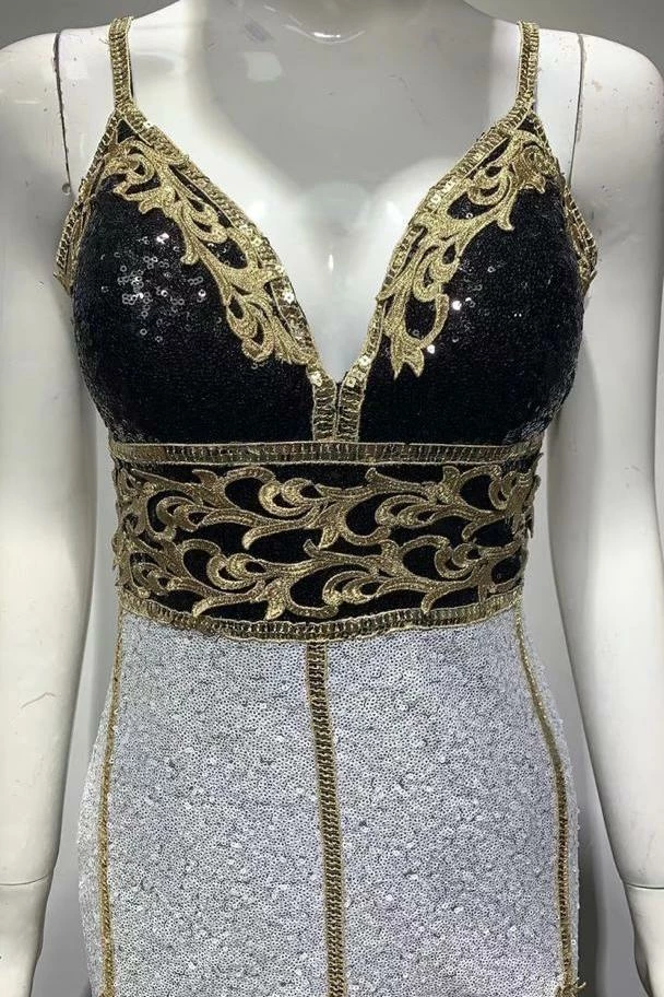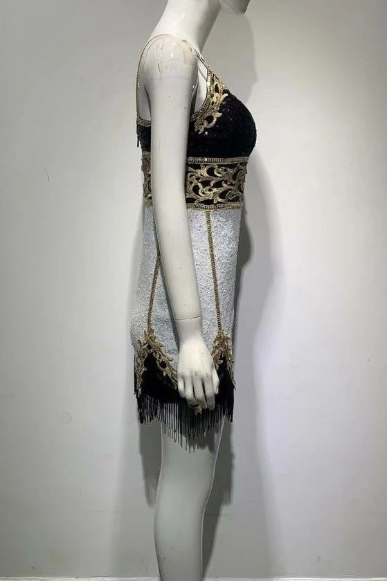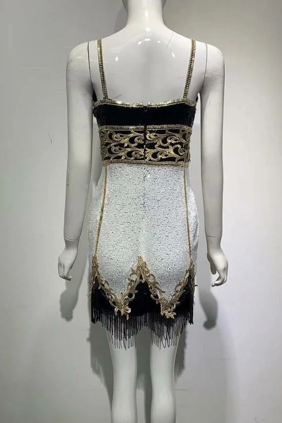 Dazzle away your next cocktail event with this sparkly mini! Featuring a fully sequin mini dress with a black, white, and gold design, thin straps, a v neck, and a fringe hem detail that will have you twirling all night long. Team this with a black crossbody bag and ankle strap heels!