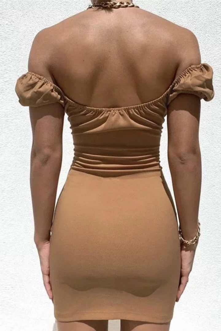 The bodycon Miriam dress comes in a light tan color and features tied cutouts in the waist, with slightly puffed shoulders. Pair with your favorite pair of mules and shoulder bag for a trendy summer look!