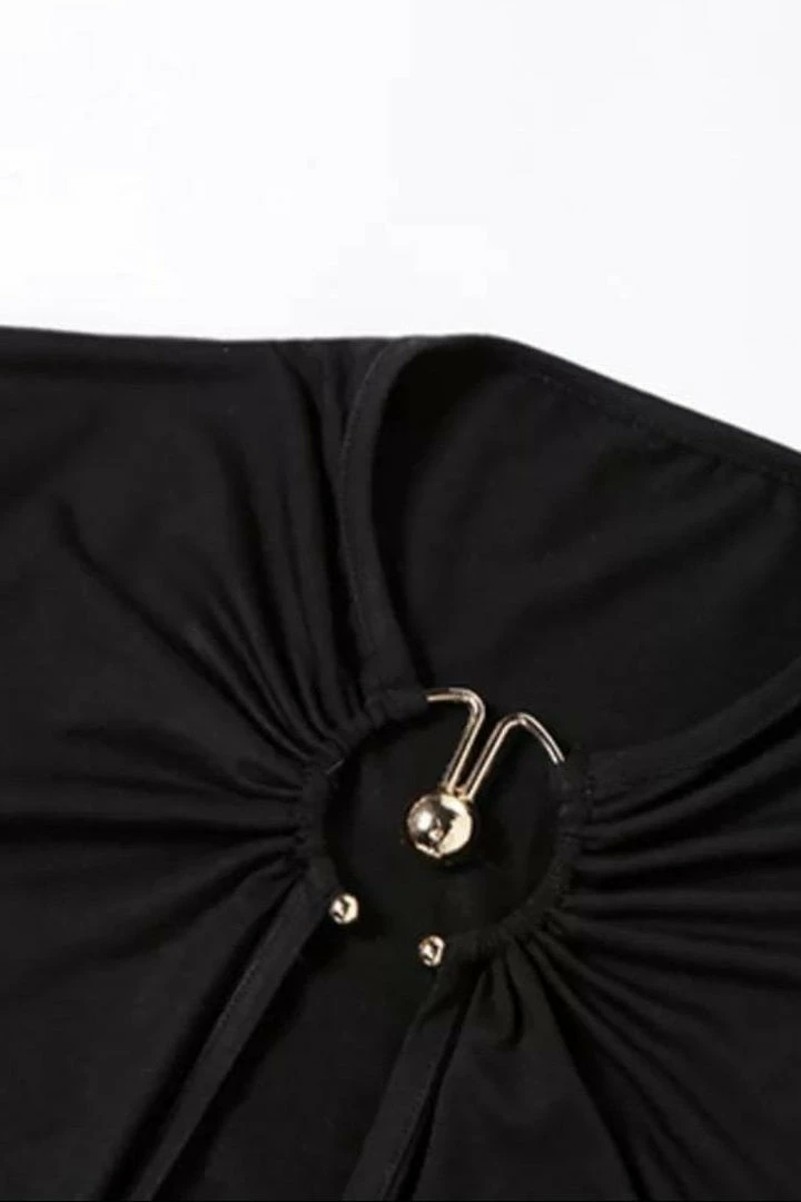 This black long sleeve bodysuit features a cut out down the center, joined by gold ringed hardware. Stay comfortable but feel sexy in the Montague, pair with your favorite black skirt and gold hoops for an edgy but chic look!