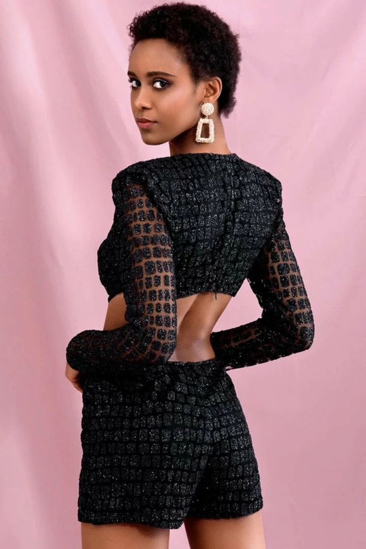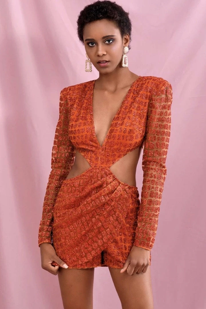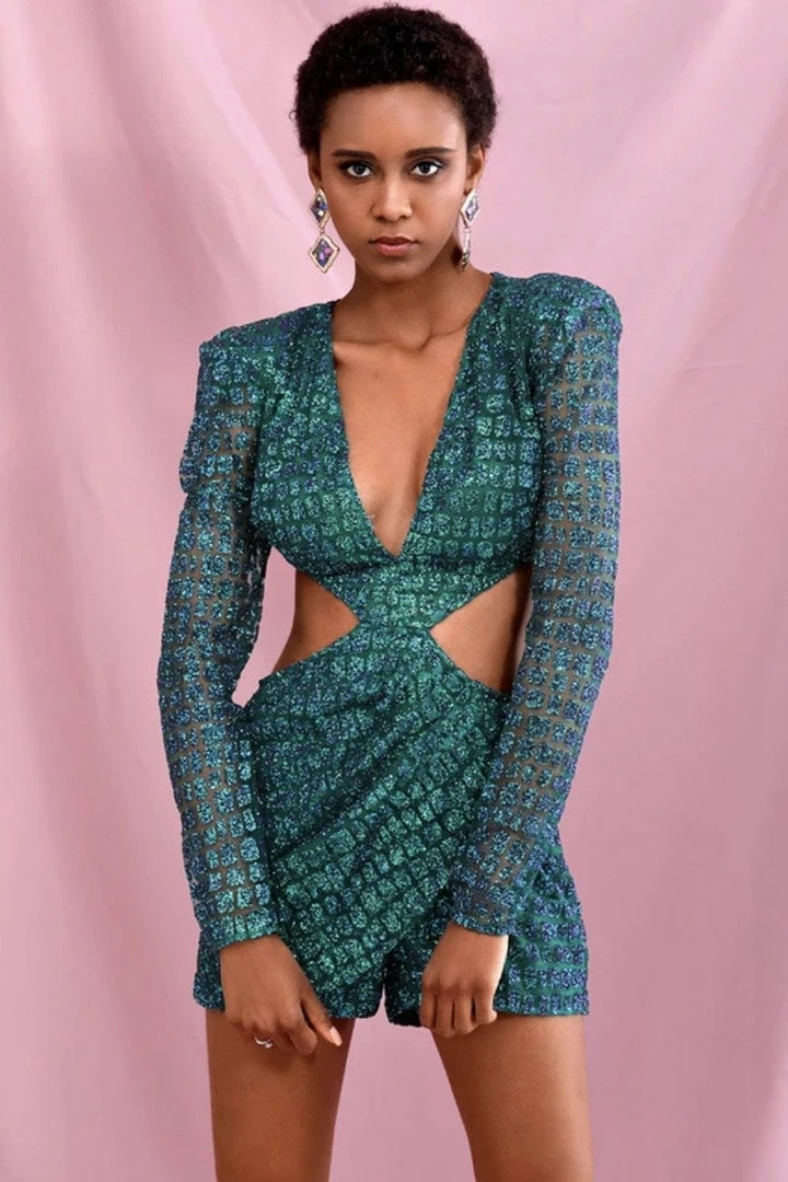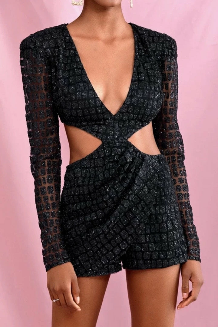 Win all the stares in this stunning romper! Featuring a glitter material, long sleeves, cut out details, deep v neck, and a mini length. Pair with stilettos and statement earrings.